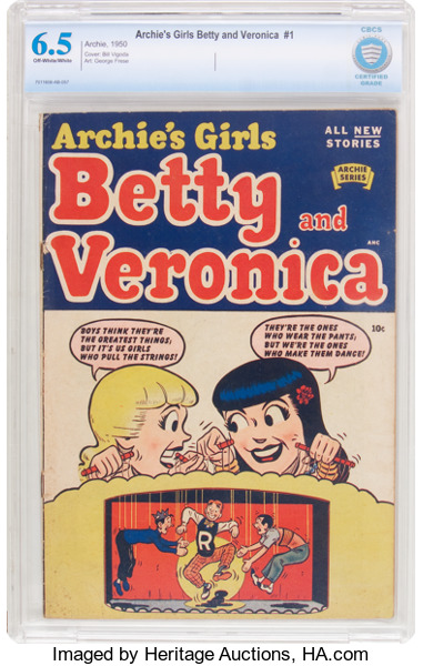 Archie's Girls Betty and Veronica #1, CBCS 6.5, off white to white pages. The girls in their first solo comic, cementing them in pop culture history. Overstreet 2017 FN 6.0 value = $978; VF 8.0 value = $2,282.