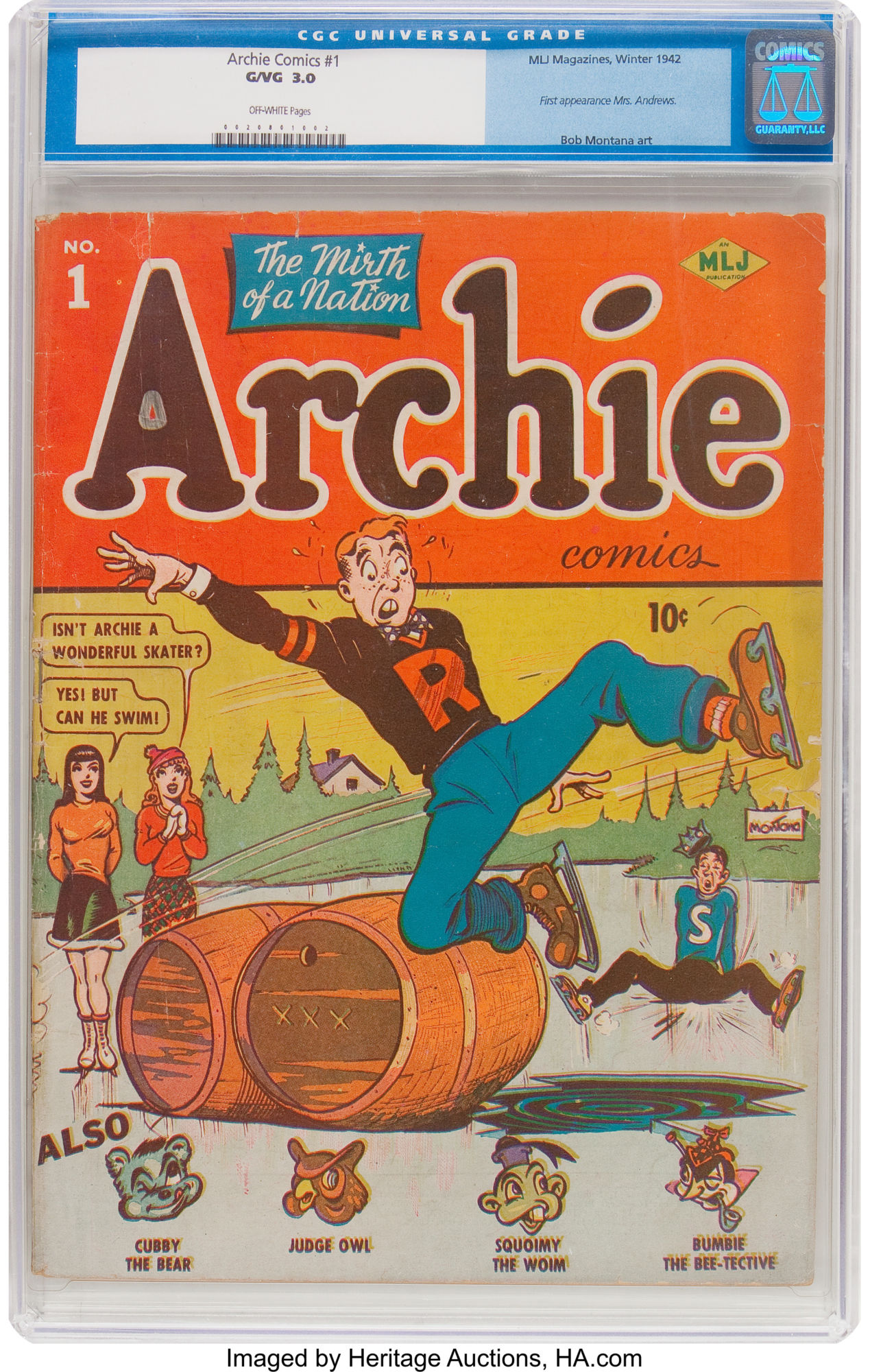 Archie Comics #1, CGC 3.0 off white pages. One of the hottest GA books to date, a copy of this book in a similar grade sold for $28k last year. By now the gang's all here, including Mrs. Andrews! Overstreet on this book is GD 2.0 value = $12,000; VG 4.0 value = $24,000.