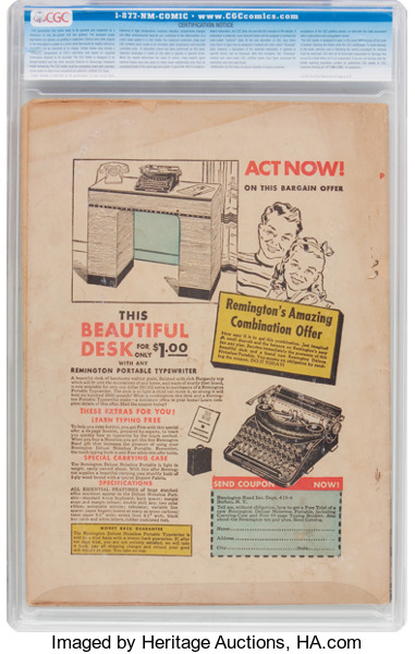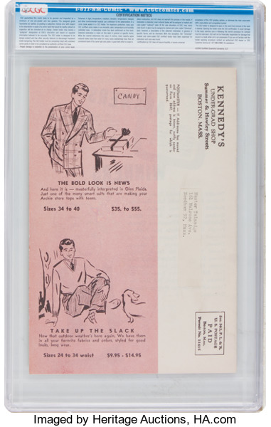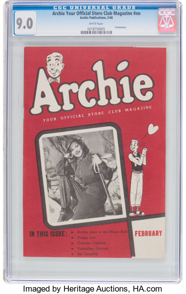 Archie Shoe-Store Giveaway, CGC 9.0 white pages. A number of these fan club magazines were published between 1948-1950, and they're always fun to see come up for auction. Overstreet 2017 VF/NM 9.0 value = $216.