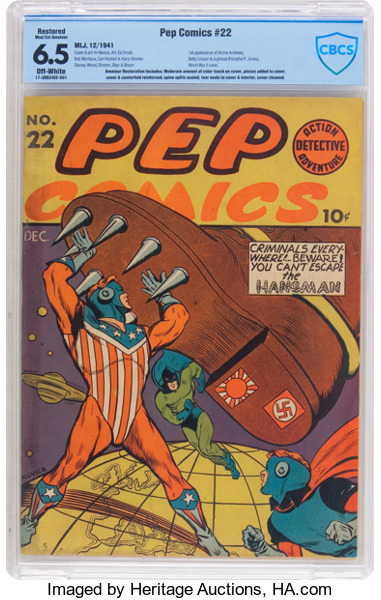 Pep Comics #22, CBCS 6.5 Restored, off white pages. The first appearance of Archie Andrews, Betty Cooper, and Jughead Jones. This book is a must have for any Archie collector, as well as anyone who collects key GA books and teen humor/romance. Currently Overstreet Guide on this book unrestored is 2.0 value = $25,000; VG 4.0 value = $50,000; FN 6.0 value = $75,000.