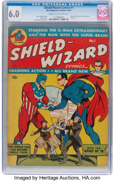 Shield-Wizard Comics #1, CGC 6.0 cream to off white pages. Classic Irv Novick cover, this is the origin story to the Shield and Wizard. This was before Archie graced the pages of Pep #22, so while newer Archie fans may not be interested, I urge you all to consider this beautiful example of this comic. Overstreet 2017 FN 6.0 value = $1,350.