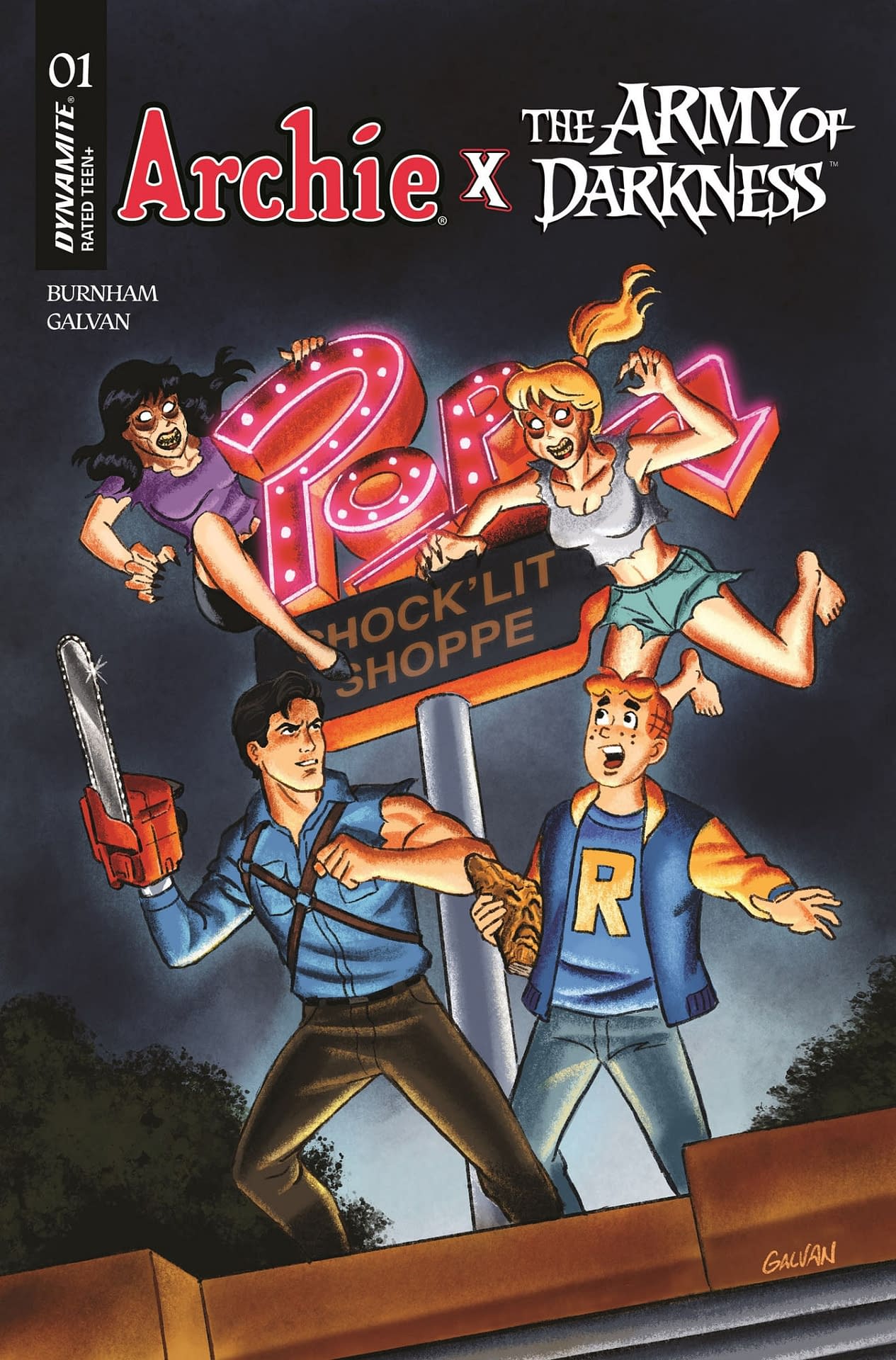 Shotguns and strawberry malts aplenty. Dynamite Entertainment and Archie Comics have revealed the creative team, Erik Burnham and Bill Galvan for the previously announced Archie x The Army of Darkness, this February. Yes, THAT Army of Darkness. Yes, THAT Archie. As a Necronomicon-fueled portal rips open above Pop's Chock'lit Shoppe with Ash Williams crash-landing into Riverdale, Deadites wearing letterman jackets, and a horde of undead cheerleaders who are REALLY committed to their pyramid routines. And probably Jughead vs. a Deadite that just wants his crown back, and hopefully Archie Andrews wielding a chainsaw while riding the Jughead-shaped hood ornament of the battered '77 Delta 88 through the halls of Riverdale High.