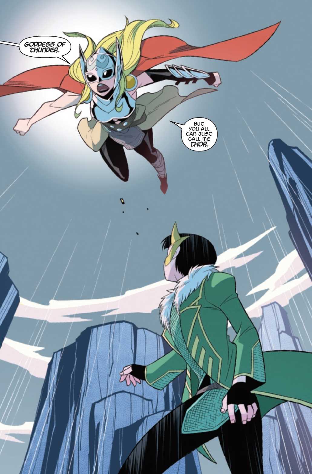 Thor and Loki: Double Trouble #3 hits stores from Marvel Comics next week, but if you can't wait that long — and hey, we're not going to judge you, you comic book junkie — you can get a little taste right now in this preview. Thor and Loki are in trouble (big surprise) and they're about to run away, when another Thor flies by to save the day: Jane Foster, the Goddess of Thunder. The solicit asks whether Jane will help The Odinson and his brother find their way home, but since this is only the third of four issues, we'll have to assume not this time. Check out the preview below.