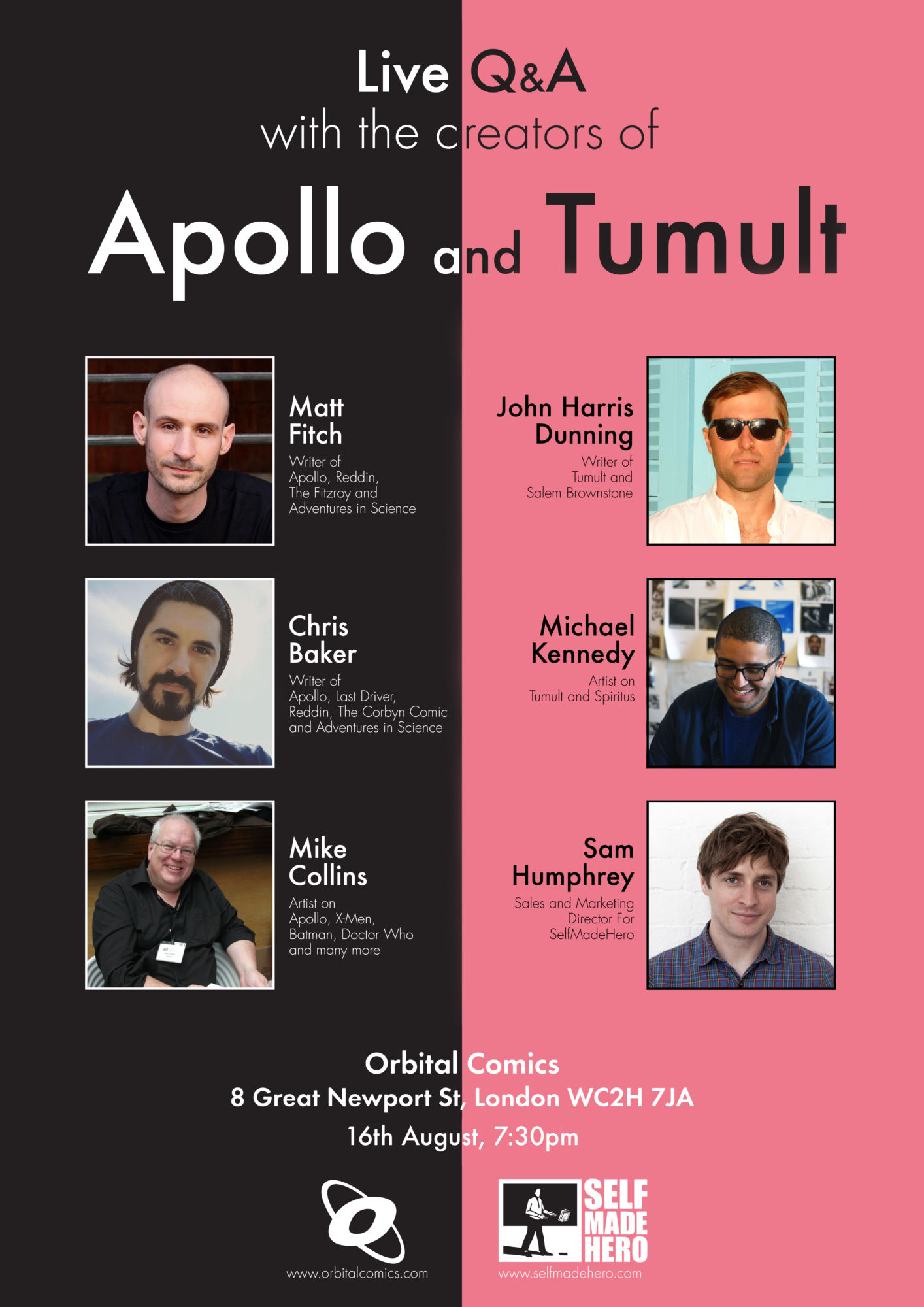 This Thursday, alongside Orbital Comics' new gallery exhibition, the creative teams behind two new graphic novels, Apollo by Matt Fitch, Christopher Baker, and Mike Collins, and Tumult by John Harris Dunning and Michael Kennedy, both published by SelfMadeHero, will be appearing in store for a Q&A session.