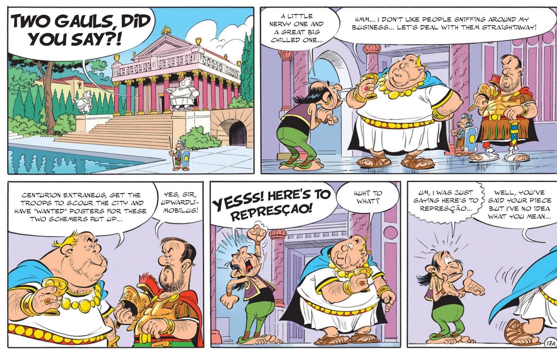 Because here is the thing, usually it is the village albums that are more satirical of modern culture. politics and life, while the travel albums examine how other countries are perceived by foreigners. What Fabcaro and Didier Conrad have been able to do is incorporate some of the satirical aspects of modern life into this travel album, just as they added travel elements to the previous village album, The White Iris. And it works really well. And so, as Asterix and Obelix's presence is noticed in the town, and Ricky Gervais is commissioned to take care of these Gaulish invaders, at the hand of one of the Portuguese traitors…