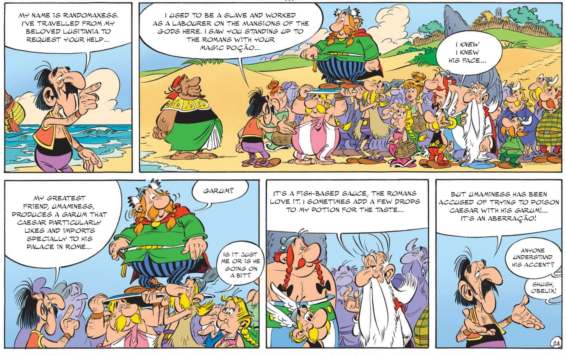 And continuing to play up on the Portuguese association with fish, fish paste and fish sauces, so that we also get economic lessons again, about what happens when industry takes over small businesses, the tricks used to gain economic dominance, both fair and foul, and what it takes to succeed in this modern world, over two thousand years ago. There are economic experts in twenty years' time whose eyes will have been opened for the first time to this sort of thing by reading Asterix In Lusitania. It really is that powerful.