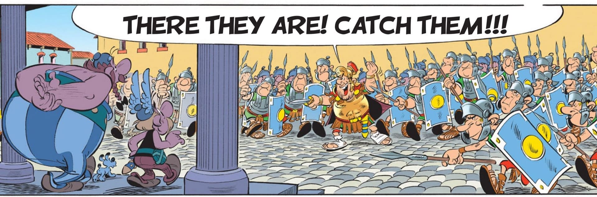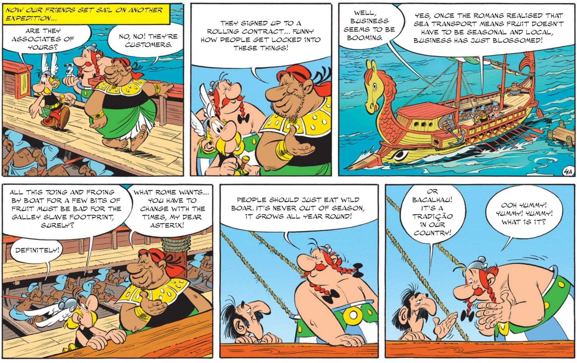 As well as a reference to the Traitors TV series. I asked if there was any intentional reference to the experience of France and the rest of continental Europe during Nazi occupation, with citizens collaborating with occupiers in running the country and the fallout after the war, and while the creators agreed, "obviously a link with the French occupation during World War II", they found that this was true the world over, many countries had been through similar experiences, "there was a Portuguese journalist who asked us why we used this idea of treasonm because as it happens, it's a really big theme in their country and history" and "journalists from Quebec who said they felt particularly moved by the story because they feel like they're a small village resisting invasion right now." And so Asterix and Obelix set sail, on a "slave" galley ship, where the slaves are actually customers, who have signed a rather restrictive contract. They clearly didn't read the small print.