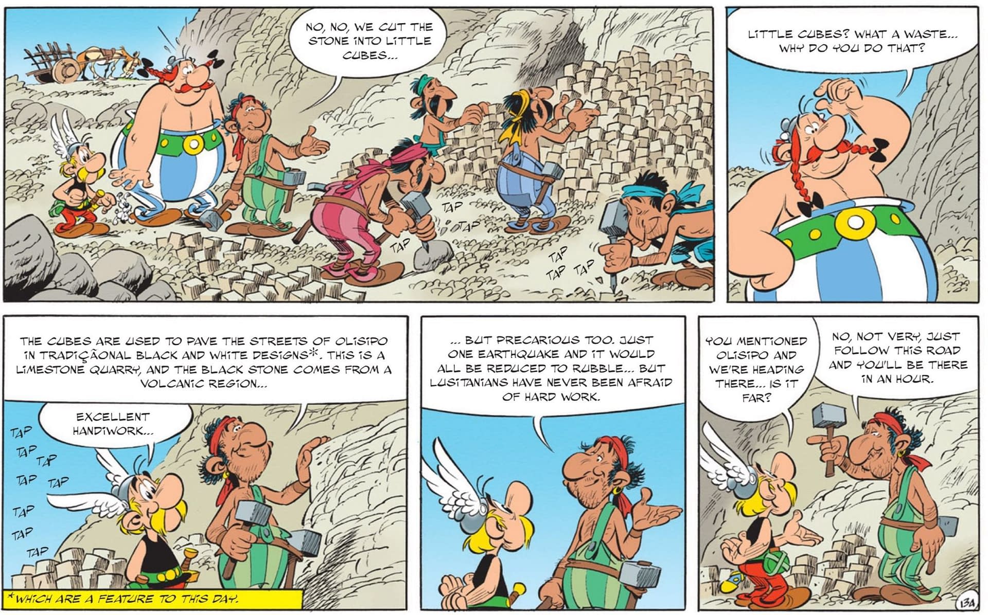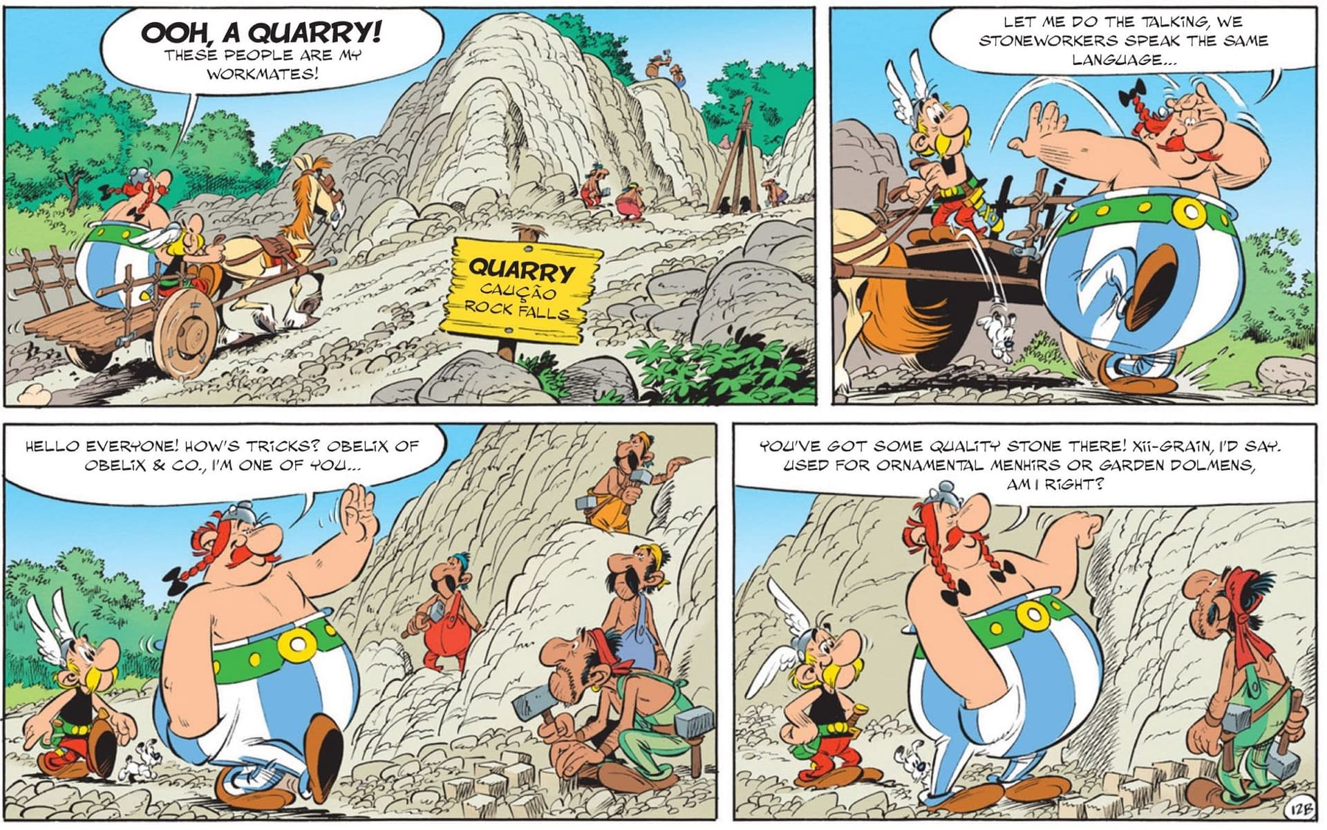And they even have environmental concerns! Travelling further sees Obelix encounter the same kind of quarry he used back in Obelix And Co, one of my very favourite Asterix books, in which his carving and carrying of menhirs, the mysterious stone objects that litter the museums of France, with no knowledge that they were just used by Obelix to flatten Roman hordes, becomes a lesson on economic demand and supply, principles taught to me at the age of eight.