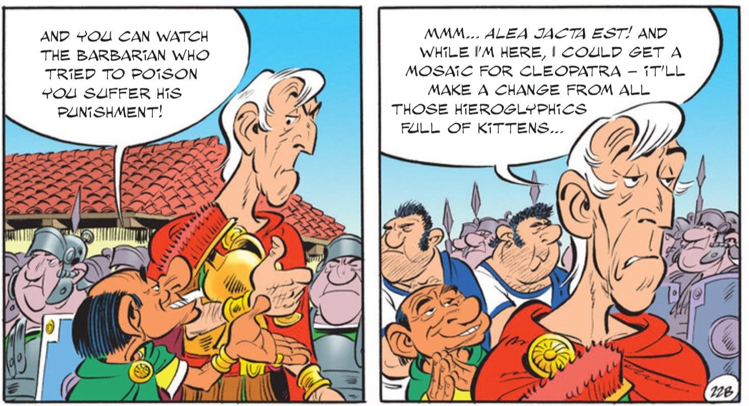 Even as it sets up some jokes from Julius Caesar that tie in his mistress being the Egyptian queen Cleopatra, the Egyptian historical association worshipping cats as deities and the current obsession of scrolling through cat videos. With just a little help with Latin familiarity taken from Shakespeare and Latin textbooks in British public schools.