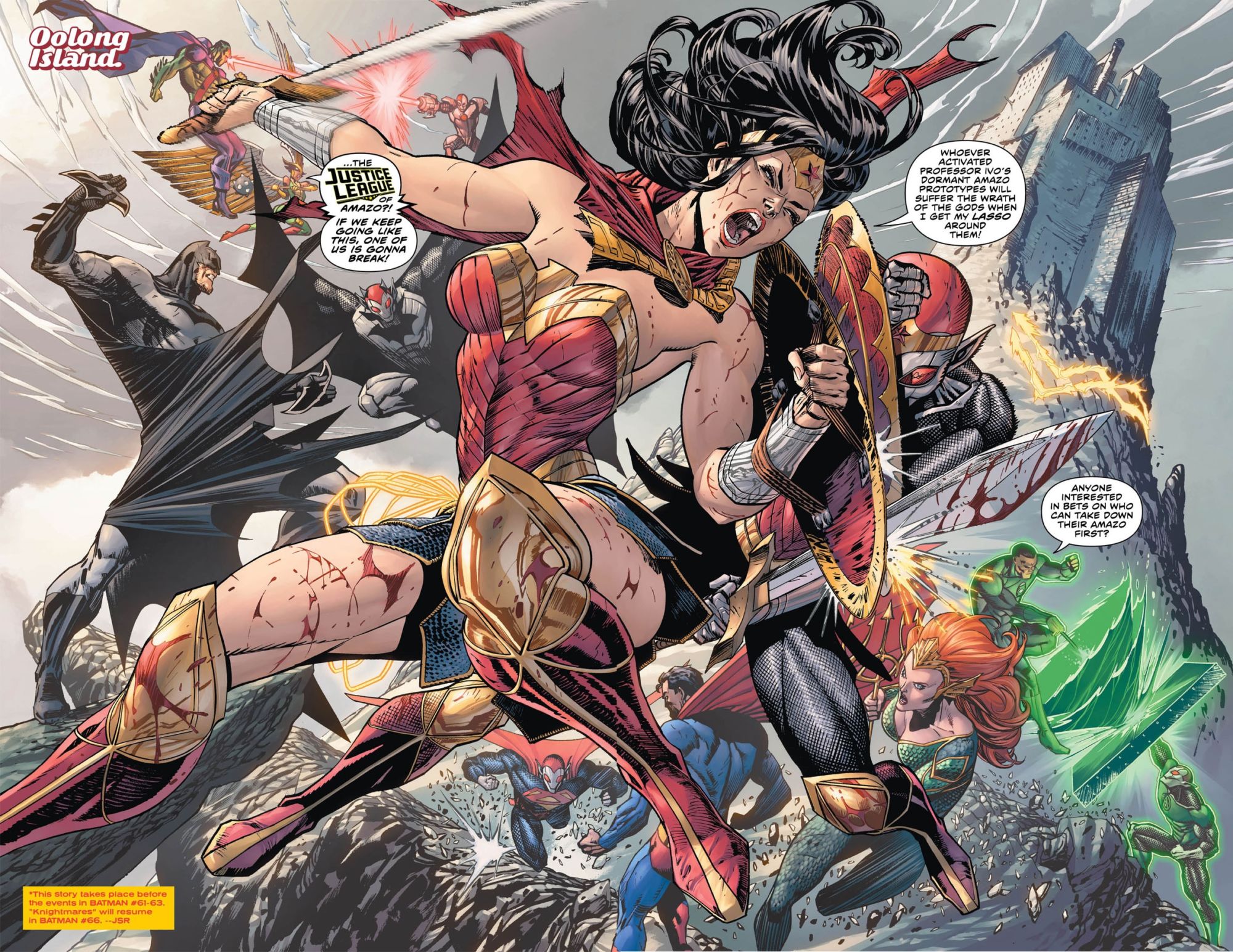 Before jumping to a nice big Justice League double splash page, fighting evil robot duplicates of themselves, the Justice League Of Amazo…