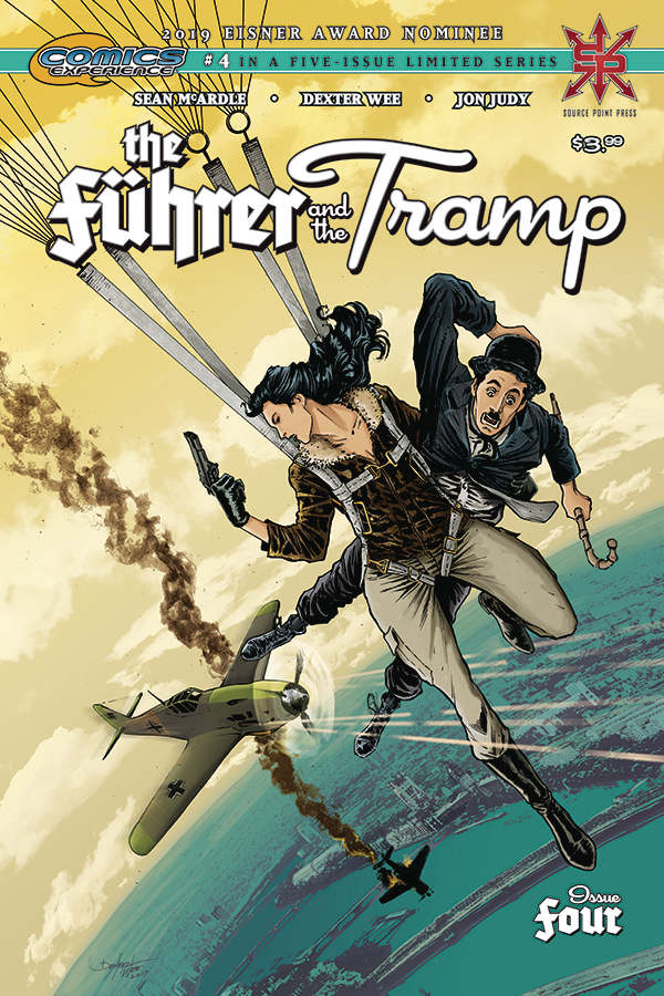 When last we saw our heroes, they had apparently been sent to a watery grave, victims of Nazi sabotage. Well buckle up and face front, Tramp believers, because here's where things start getting dangerous! In this one single issue, you'll see Charlie Chaplin, Hedy Lamarr, and Errol Flynn: battling sharks; making movies with Alfred Hitchcock; dodging bombs during the London blitz; and dogfighting Nazis over the skies of merry old England! And all that's before the dramatic cliffhanger, where Charlie's inevitable showdown with Adolf Hitler himself gets real personal, real fast!