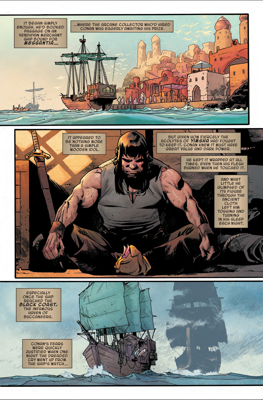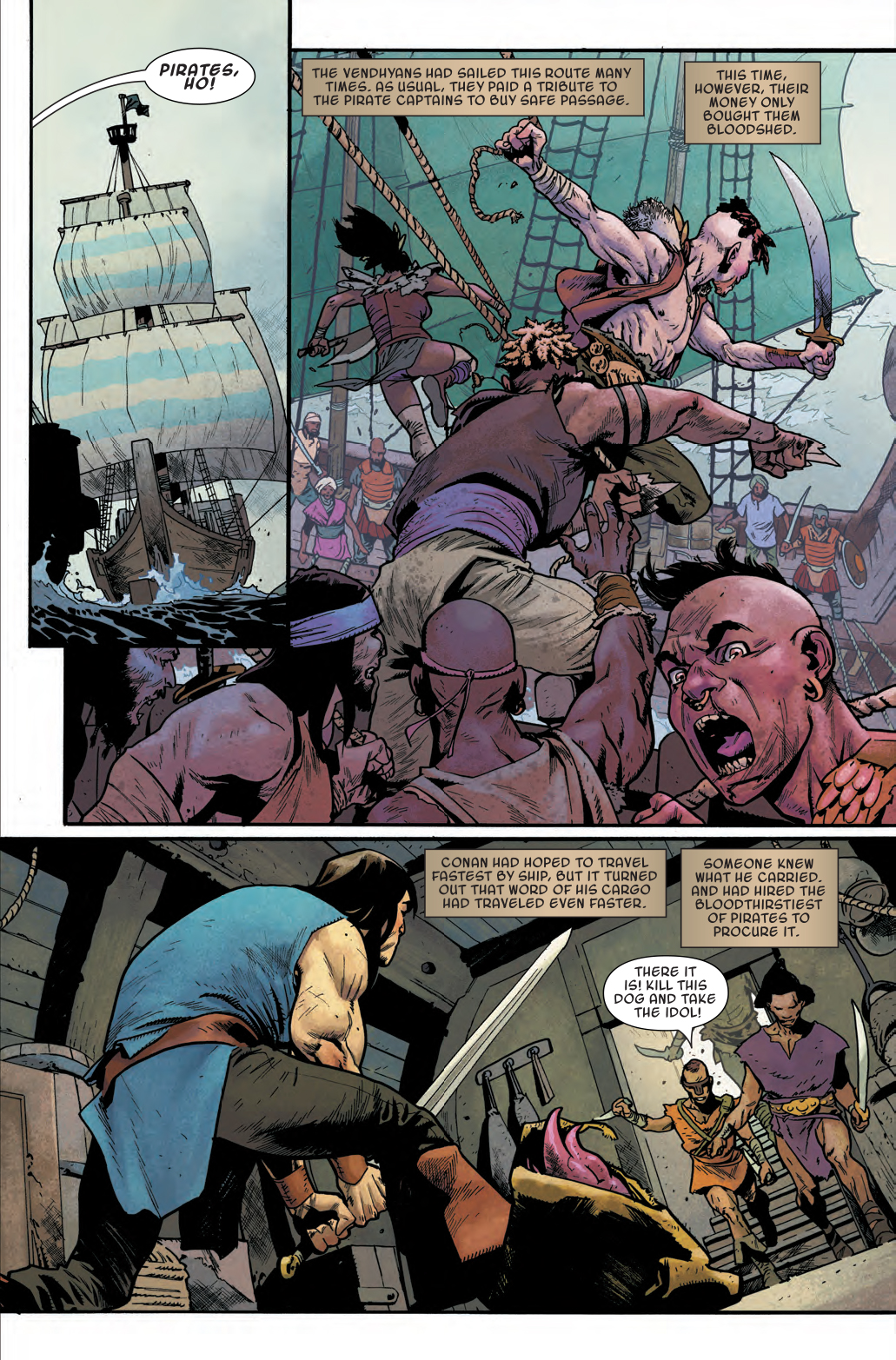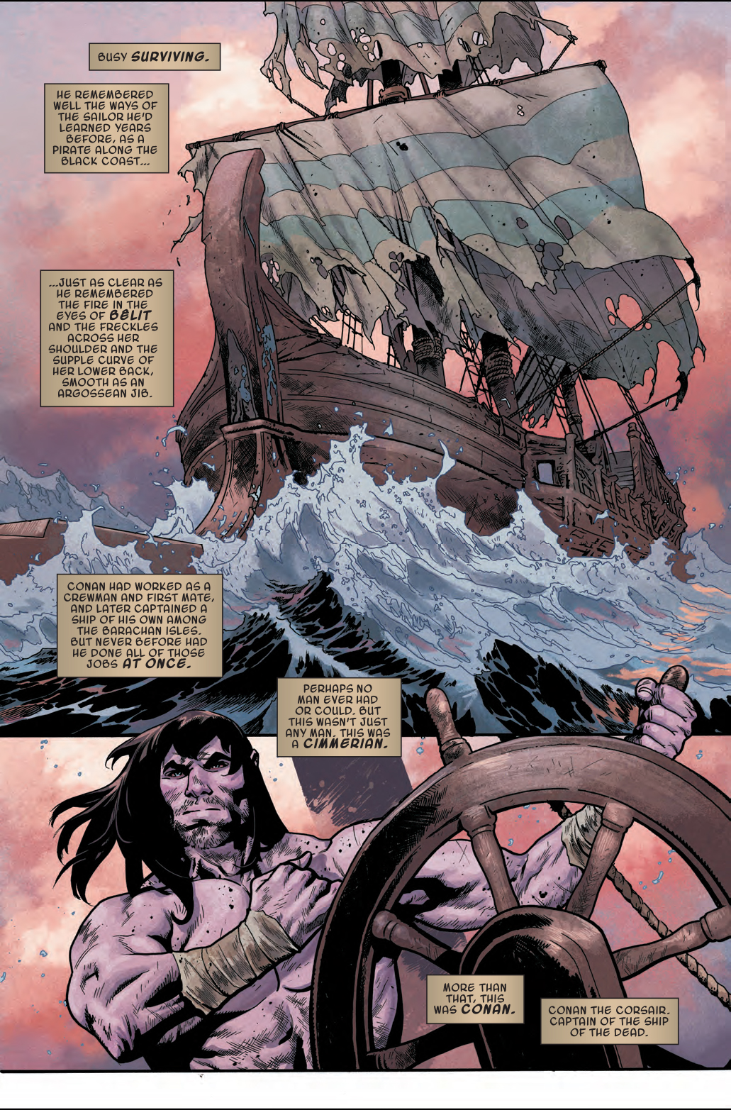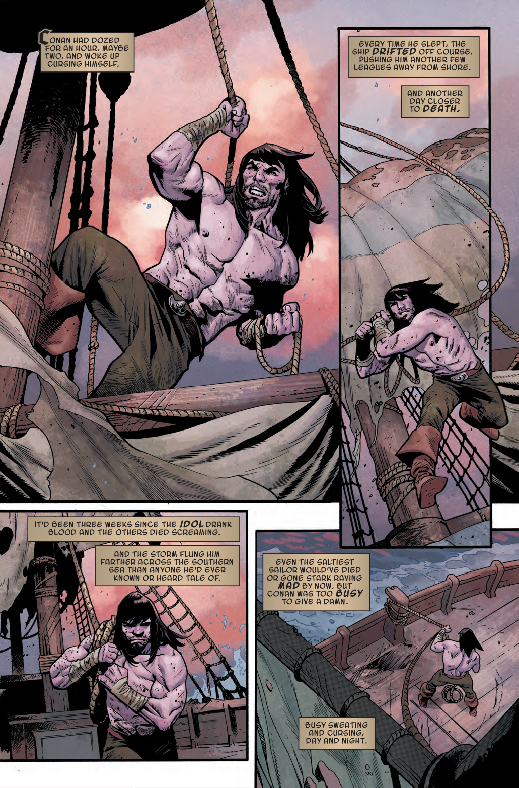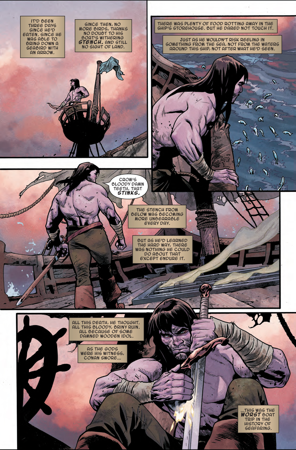 Next week in Conan the Barbarian #5, the titular barbarian is taking a nice, relaxing vacation on a boat he presumably reserved through the Hyperborean version of AirBNB. But it seems that the listing may have exaggerated certain amenities, such as food, lack of stench, and a pleasant view of calm ocean waters. Because three days into his trip, Conan is definitely finding out that his dream vacation has turned into a nightmare…