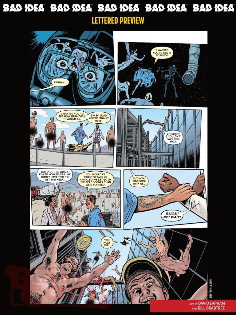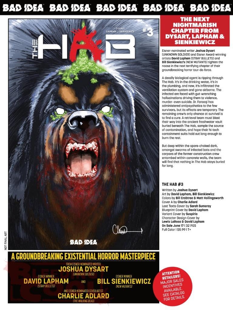 Eisner-nominated writer Joshua Dysart (UNKNOWN SOLDIER) and Eisner Award-winning artists David Lapham (STRAY BULLETS) and Bill Sienkiewicz's (NEW MUTANTS) tighten the noose in the next terrifying chapter of their groundbreaking horror tour-de-force. A deadly biological agent is ripping through The Hab. It's in the drinking water, it's in the plumbing, and now, it's infiltrated the ventilation system and gone airborne. The infected are faced with gut-wrenching hallucinations driving them to violence, murder–even suicide. Dr. Farooqi has administered antipsychotics to the few survivors, but its effects are temporary. The remaining crew's only chance at survival is to stop the spread and find a cure. A retrieval team must blast their way into the ancient freshwater vault buried beneath The Hab, sample the contaminated water source, and hope their hi-tech containment suits hold out long enough to burn the rest. But deep within the spore-choked dark, amongst swarms of infected bats and the corpses of the former construction crew entombed within concrete walls, the team will find that nothing in The Hab stays buried for long.
