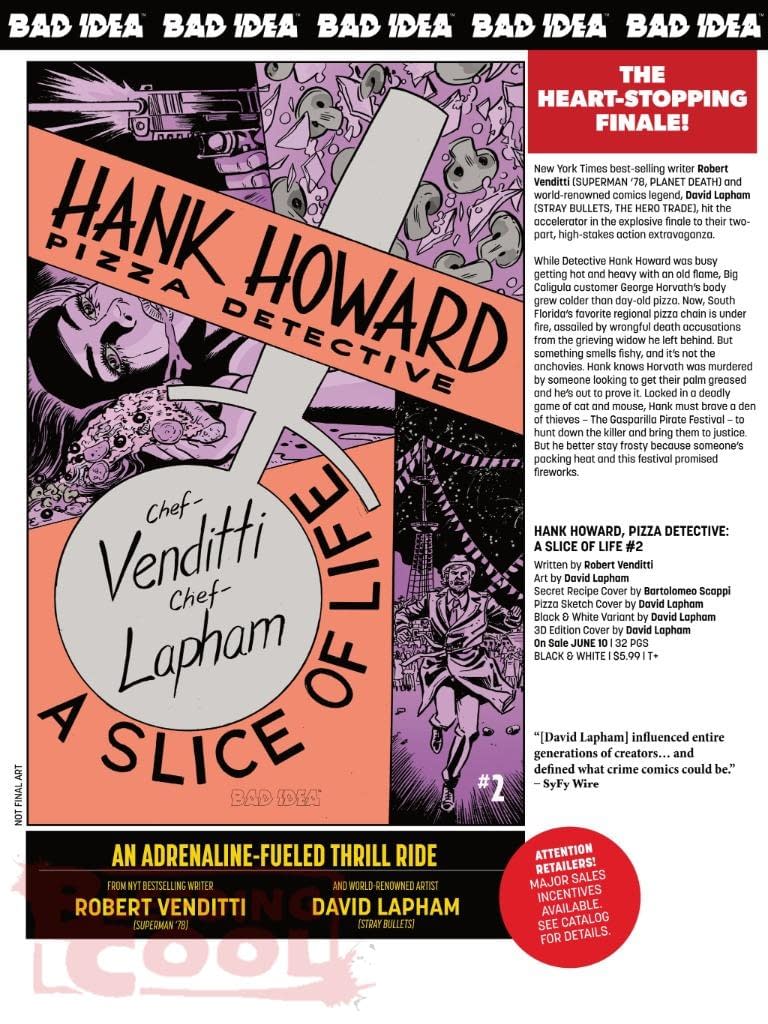 New York Times best-selling writer Robert Venditti (SUPERMAN '78, PLANET DEATH) and world-renowned comics legend, David Lapham (STRAY BULLETS, THE HERO TRADE), hit the accelerator in the explosive finale to their two-part, high-stakes action extravaganza. While Detective Hank Howard was busy getting hot and heavy with an old flame, Big Caligula customer George Horvath's body grew colder than day-old pizza. Now, South Florida's favorite regional pizza chain is under fire, assailed by wrongful death accusations from the grieving widow he left behind. But something smells fishy, and it's not the anchovies. Hank knows Horvath was murdered by someone looking to get their palm greased and he's out to prove it. Locked in a deadly game of cat and mouse, Hank must brave a den of thieves – The Gasparilla Pirate Festival – to hunt down the killer and bring them to justice. But he better stay frosty because someone's packing heat and this festival promised fireworks.