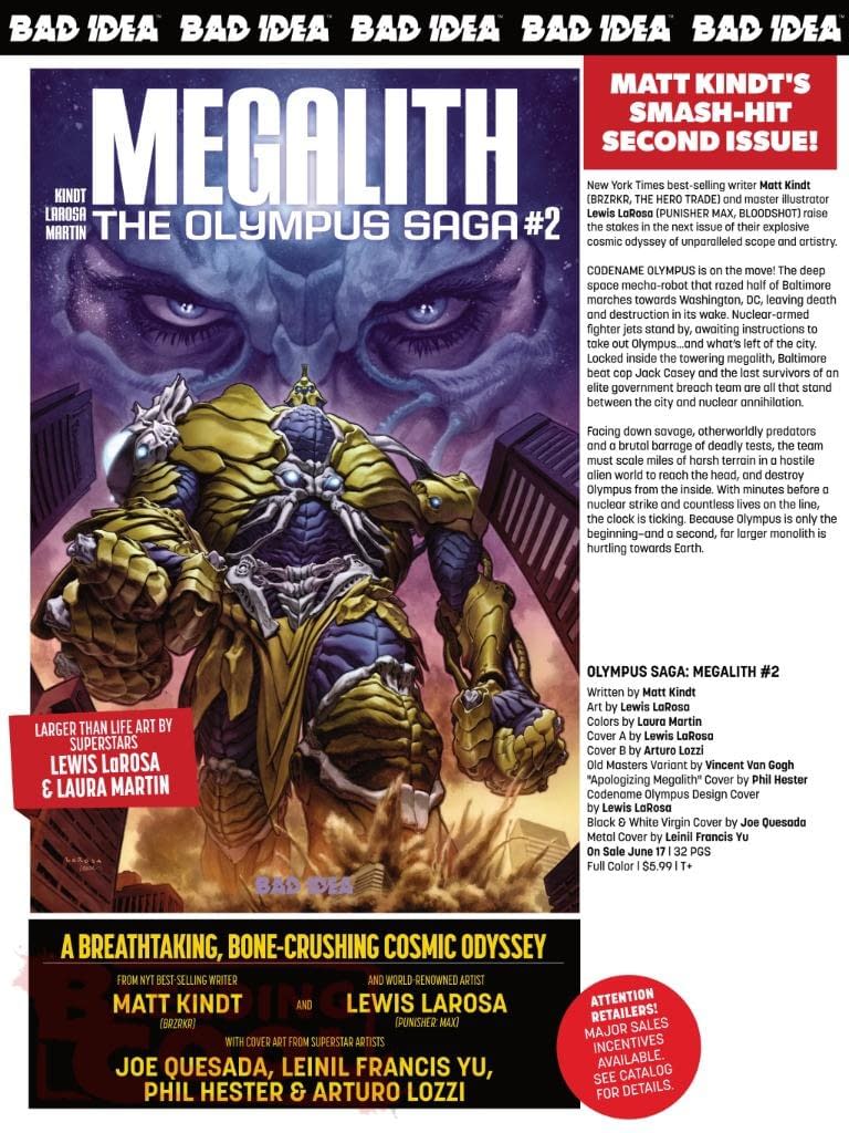New York Times best-selling writer Matt Kindt (BRZRKR, THE HERO TRADE) and master illustrator Lewis LaRosa (PUNISHER MAX, BLOODSHOT) raise the stakes in the next issue of their explosive cosmic odyssey of unparalleled scope and artistry. CODENAME OLYMPUS is on the move! The deep space mecha-robot that razed half of Baltimore marches towards Washington, DC leaving death and destruction in its wake. Nuclear-armed fighter jets stand by, awaiting instructions to take out Olympus…and what's left of the city. Locked inside the towering megalith, Baltimore beat cop Jack Casey and the last survivors of an elite government breach team are all that stand between the city and nuclear annihilation. Facing down savage, otherworldly predators and a brutal barrage of deadly tests, the team must scale miles of harsh terrain in a hostile alien world to reach the head, and destroy Olympus from the inside. With minutes before launch and countless lives on the line, the clock is ticking. Because Olympus is only the beginning–and a second, far larger monolith is hurtling towards Earth.