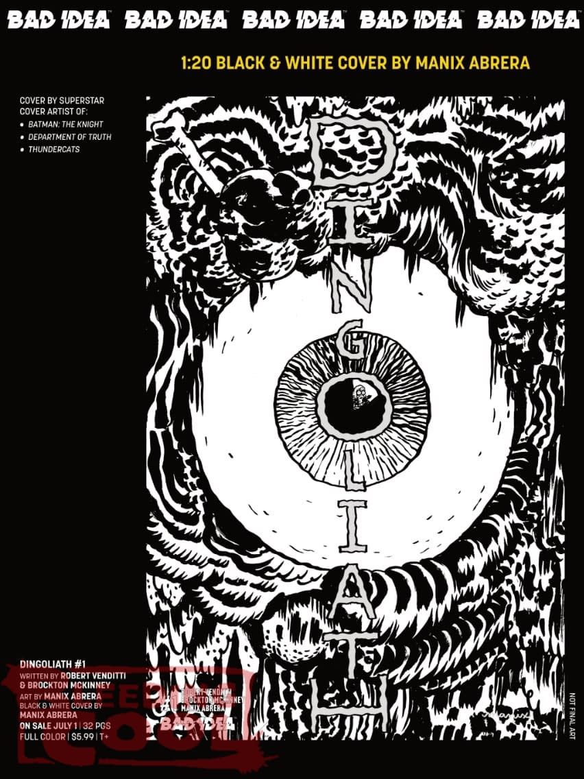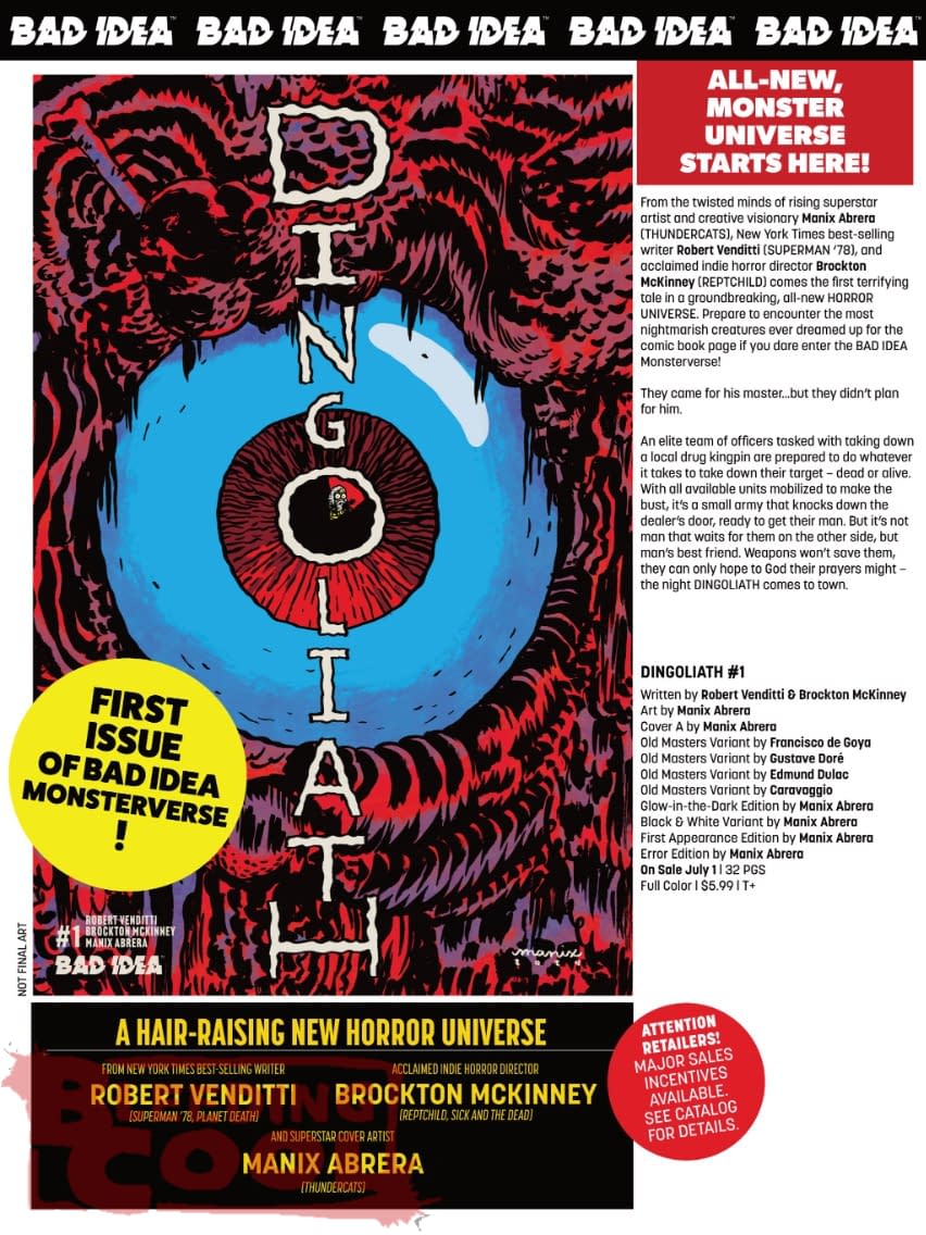 From the twisted minds of rising superstar artist and creative visionary Manix Abrera (THUNDERCATS), New York Times best-selling writer Robert Venditti (SUPERMAN '78), and acclaimed indie horror director Brockton McKinney (REPTCHILD) comes the first terrifying tale in a groundbreaking, all-new HORROR UNIVERSE. Prepare to encounter the most nightmarish creatures ever dreamed up for the comic book page if you dare enter the Manix Monsterverse! They came for his master…but they didn't plan for him. An elite team of officers tasked with taking down a local drug kingpin are prepared to do whatever it takes to take down their target – dead or alive. With all available units mobilized to make the bust, it's a small army that knocks down the dealer's door, ready to get their man. But it's not man that waits for them on the other side, but man's best friend. Weapons won't save them, they can only hope to God their prayers might – the night DINGOLIATH comes to town.