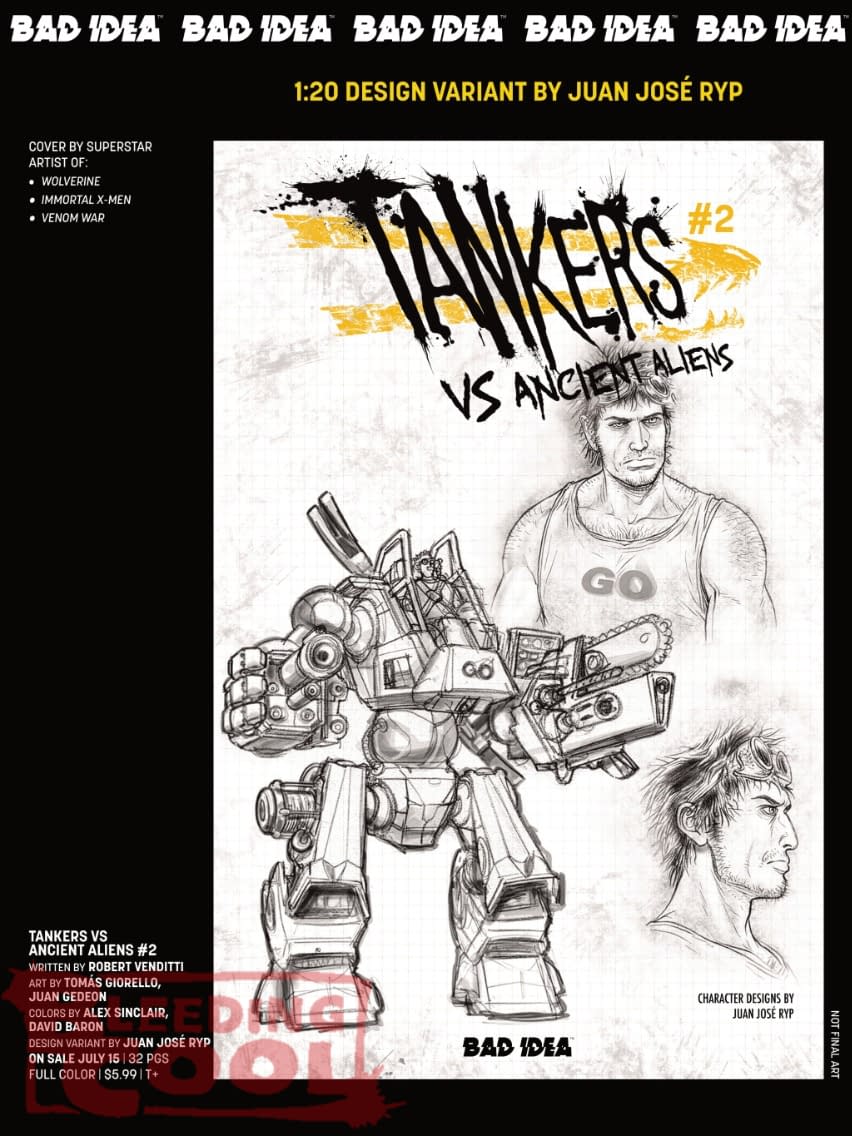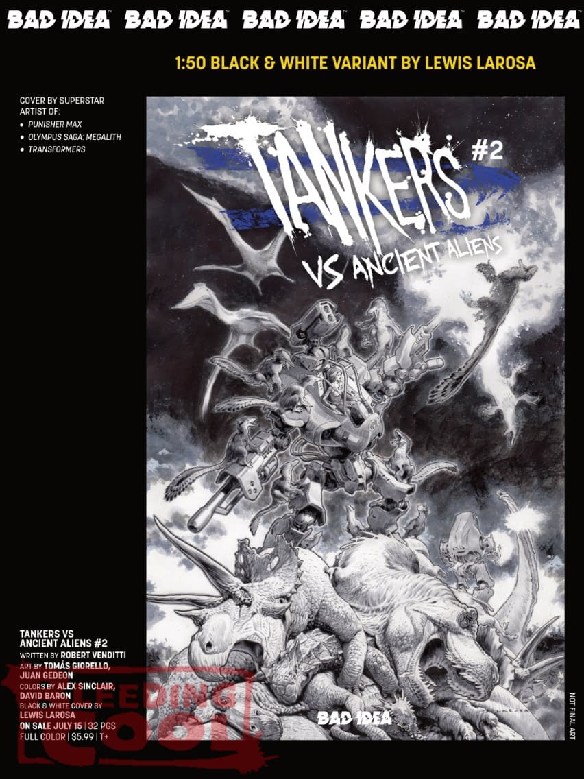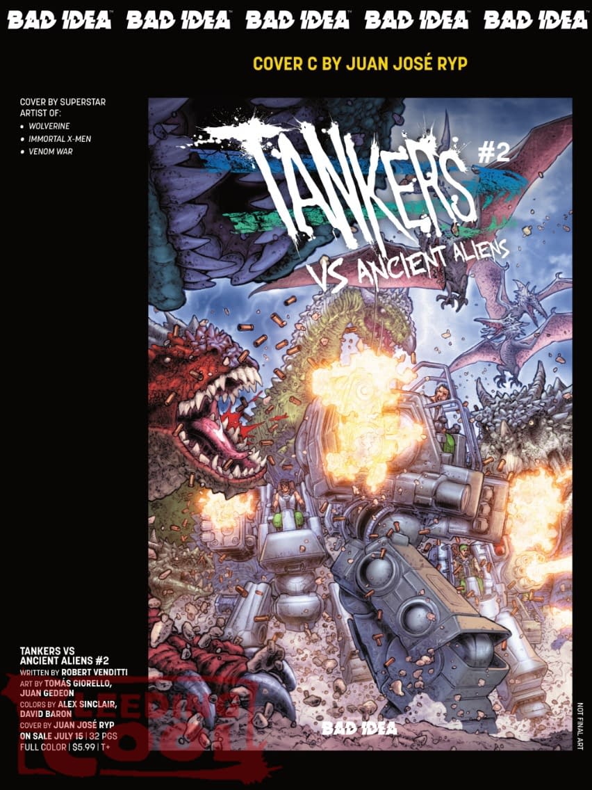 New York Times best-selling writer Robert Venditt (SUPERMAN '78) and world-renowned comics legend David Lapham (STRAY BULLETS) join forces to deliver a must-read new entry in their striking new vision in the fight against crime. Something's rotten at Big Caligula's Pizza, location #212 — and it's not just last week's mozzarella. Cash tips have fallen off a cliff, and the question on everyone's lips is, why? Has service really gone downhill, or is there something, or someone, more sinister to blame? Corporate smells trouble, and they've called in their best man for the job. Enter, Hank Howard. Armed with a mind as sharp as a tack, nerves of steel, and an ironclad stomach, Hank's about to dive into a mystery hotter than a fresh-baked pie and his only lead won't talk. Literally. It's the location's mascot, Biggie. The employees who don the oversized Roman Emperor garb are forbidden from talking in front of customers. Ruins the illusion for the kids. Thankfully, Hank's not flying solo. Location #212 just happens to be the stomping grounds of Hank's old buddy, the pizza crust loving dog, Cali. Together, they'll sniff out clues, chomp down leads, and uncover secrets that could rock the pizza world to its core. $5.99 7/1/2026 - TANKERS VS ANCIENT ALIENS #2 (OF 4)