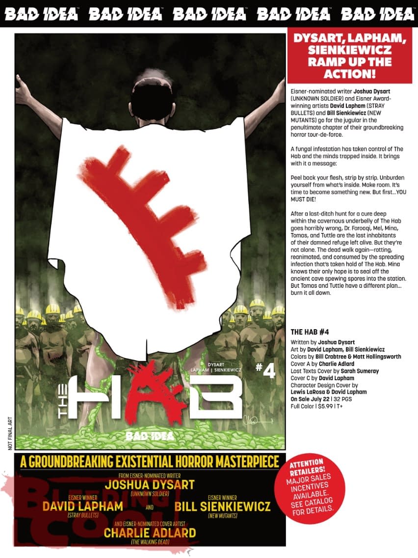 Eisner-nominated writer Joshua Dysart (UNKNOWN SOLDIER) and Eisner Award-winning artists David Lapham (STRAY BULLETS) and Bill Sienkiewicz (NEW MUTANTS) go for the jugular in the penultimate chapter of their groundbreaking horror tour-de-force. A fungal infestation has taken control of The Hab–and the minds trapped inside. It brings with it a message: Peel back your flesh, strip by strip. Unburden yourself from what's inside. Make room. It's time to become something new. But first…YOU MUST DIE! After a last-ditch hunt for a cure deep within the cavernous underbelly of The Hab goes horribly wrong, Dr. Farooqi, Mel, Mina, Tomas, and Tuttle are the last inhabitants of their damned refuge left alive. But they're not alone. The dead walk again—rotting, reanimated, and consumed by the spreading infection that's taken hold of The Hab. Mina knows their only hope is to seal off the ancient cave spewing spores into the station. But Tomas and Tuttle have a different plan…burn it all down.