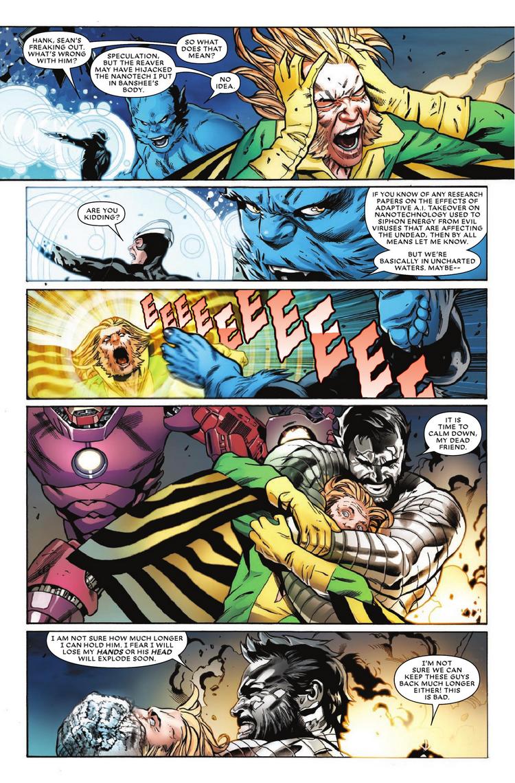 Has anyone noticed something's been a little off with Banshee since his return at the beginning of Matthew Rosenberg and Greg Land's lame duck Astonishing X-Men run? It turns out that The Beast has been counteracting the death seed in Banshee's heart with nanobots, allowing him to fight for the X-Men, even if he doesn't seem to actually know what he's doing. Par for the course from The Beast, who honestly might as well be a villain at this point.