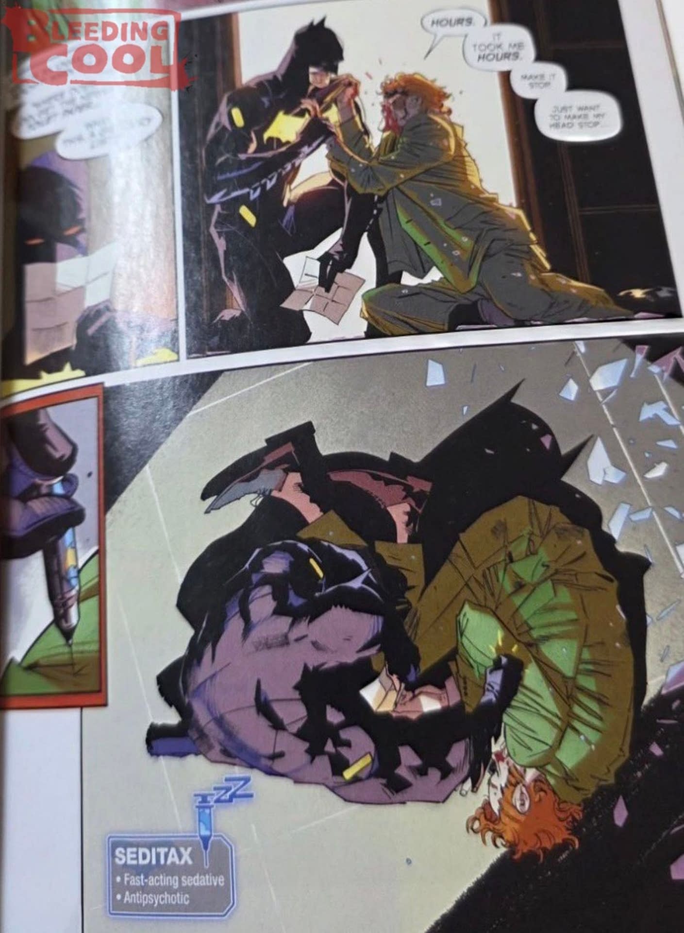 A sedative with a needle to match. Why Bruce Wayne would need to carry drugs around his person that he could surreptitiously use to slump those around him into unconsciousness, we may never know. However, it does suggest that at some point, someone will make some worrying allegations. Say, very fictional people of Gotham City who have found themselves in a social situation in Gotham City, with inexplicably missing hours in their night… have you been Bat-Roofied? Batman #3 by Matt Fraction and Jorge Jimenez is out this Wednesday from DC Comics