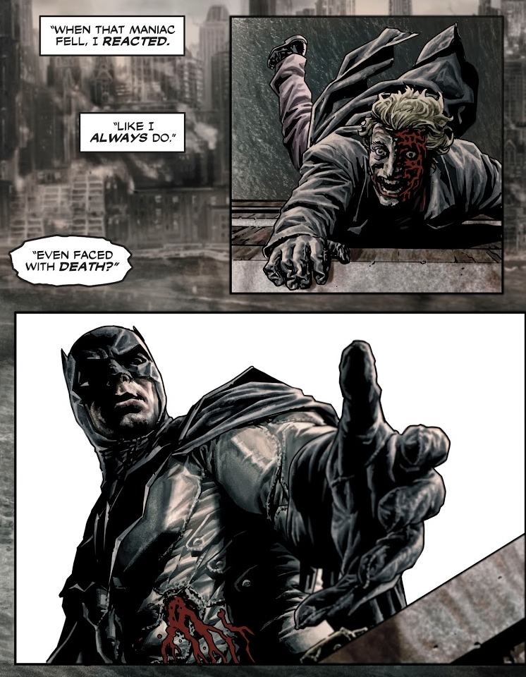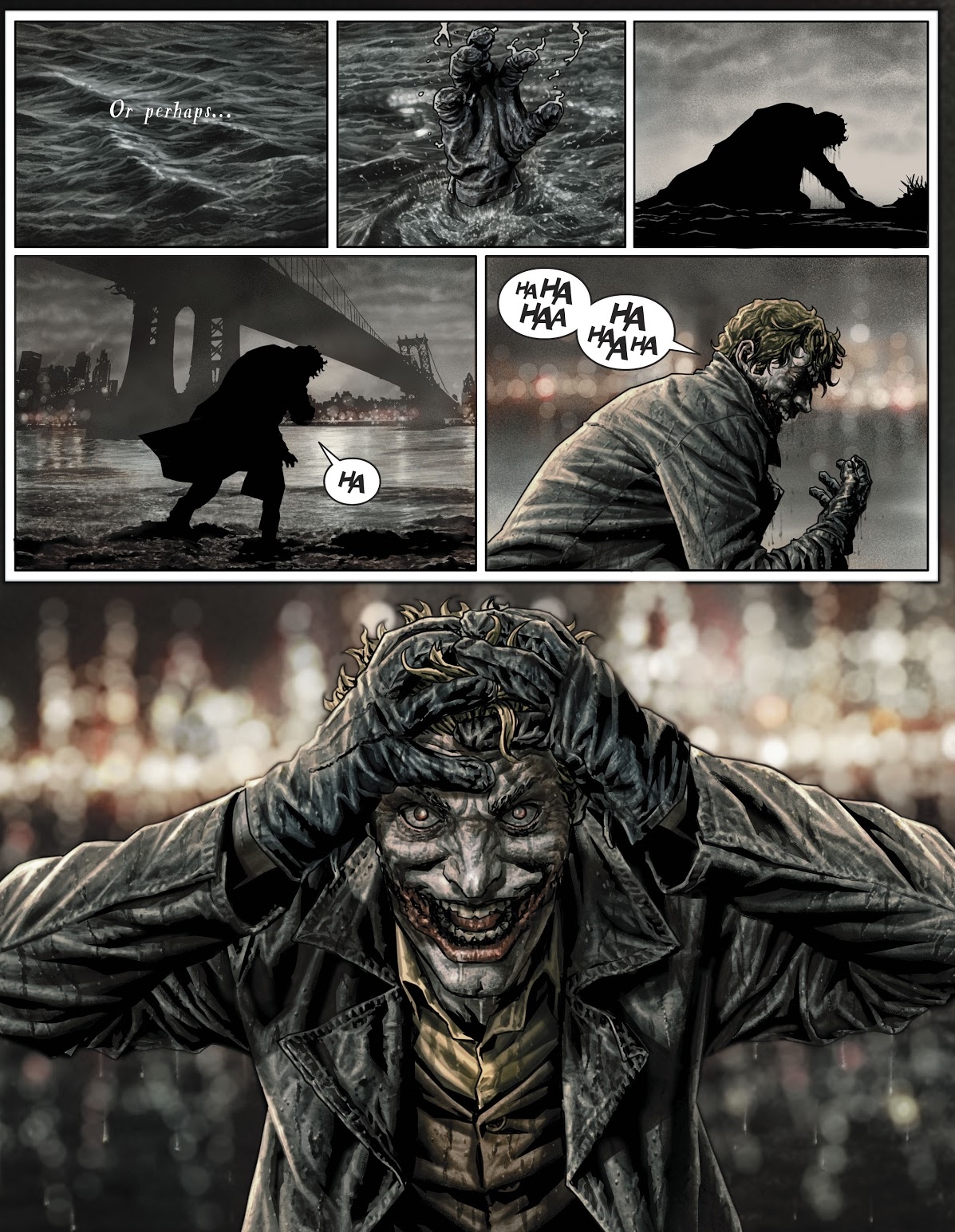 The Joker, provoked by Batman's taunts, shoots Frost in the chin, disfiguring his face into a grotesque 'smile'. The Joker and Batman fight on eternally as Frost climbs over the edge of the bridge and falls into the river, seemingly avoiding his fate to become one of them. The page below is from Joker.