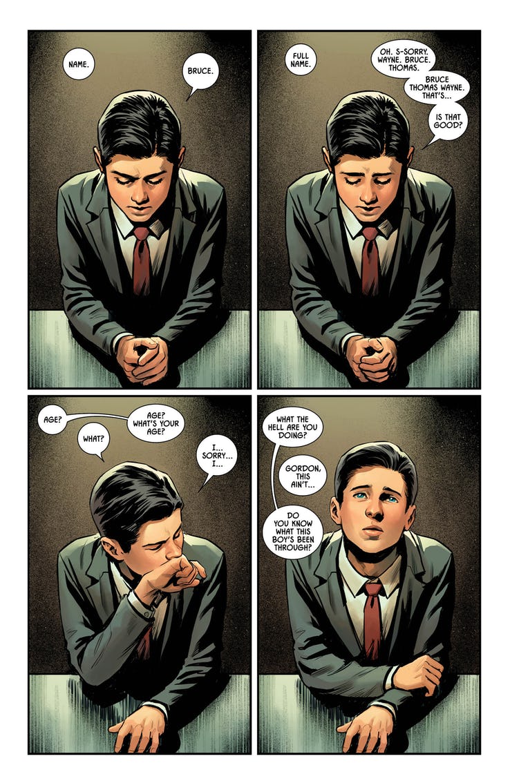 Normally, Batman dedicates his crimefighting efforts to beating the crap out of the mentally ill while dressed up in a bat costume. But in this week's Batman #61, Batman focuses his efforts in another direction: interrogating a child. But not just any child. Batman interrogates a young Bruce Wayne about the murder of his parents.