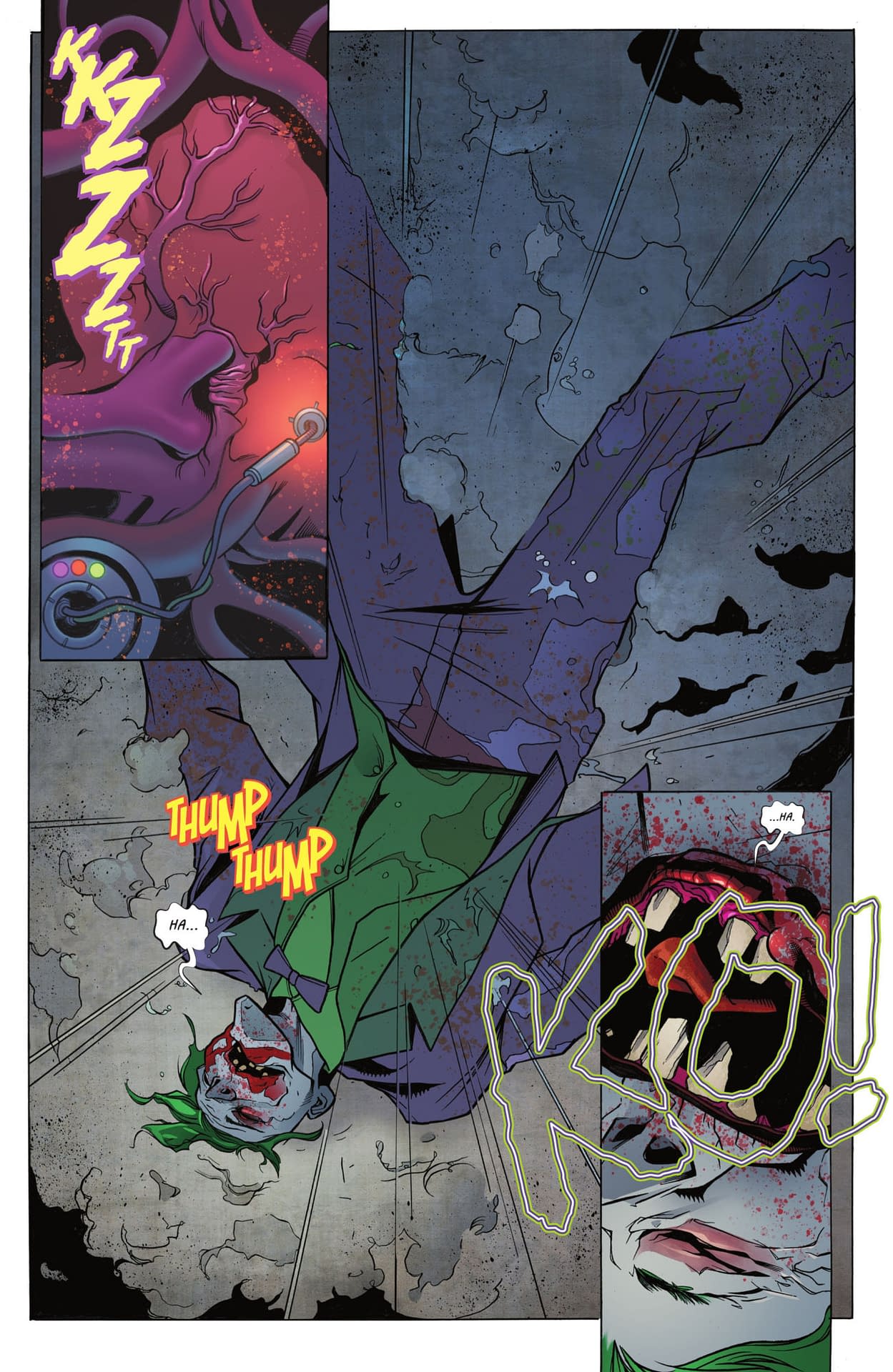 But this still counts as Batman killing The Joker. Batman has taken an oath, sworn not to kill and in the past (and the future), that has included The Joker. Not in the films, of course, he always kills him then. But the comics? Even in Frank Miller's Dark Knight Returns, he didn't do that. Not killing the Joker was what Batman: H2SH has all been about. To go through all that to save the Joker just to kill him again? He has come close before… Batman left the Joker to die in the most recent Batman #100, Detective Comics #741 had Batman allow Gordon to kill the Joker (he didn't), he abandons Joker in a crashing helicopter in A Death In The Family, Batman stops the Joker from accessing Dionesium to heal his wounds in the most recent-but-one New 52 Batman #40, Batman: Damned has Batman let Joker die, and in alternate universes, Batman kills Joker on live TV in JLA: The Nail, a vampire Batman kills The Joker in Bloodstorm, Batman kills The Joker in the Dark Multiverse, infecting him as the Batman Who Laughs. But those were all Elseworlds… what does it count as this time? DC K.O. #4 by Scott Snyder and Javi Fernandez is published today by DC Comics.