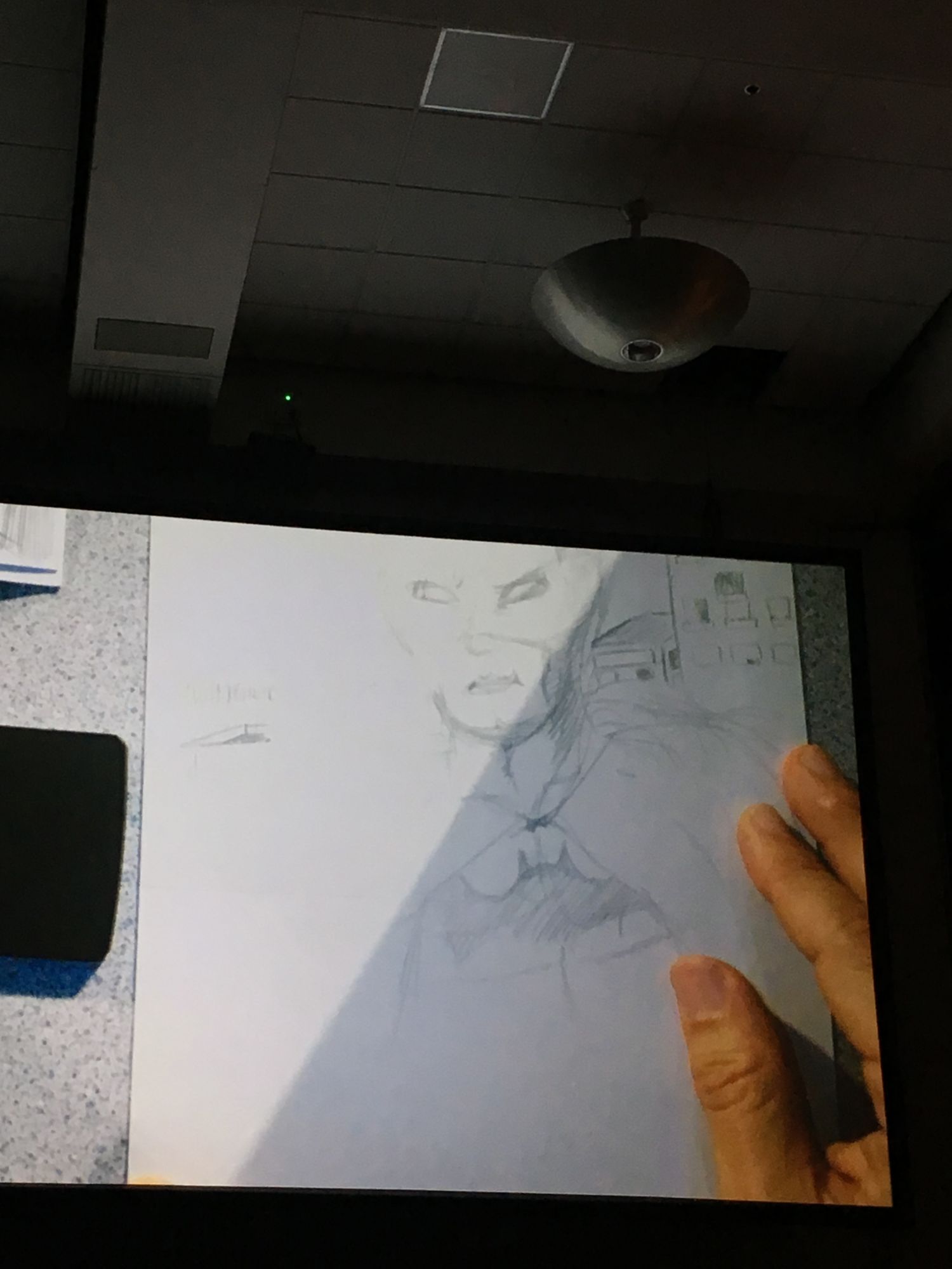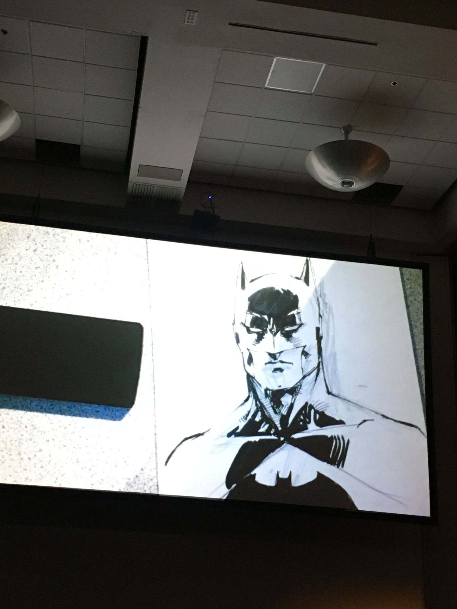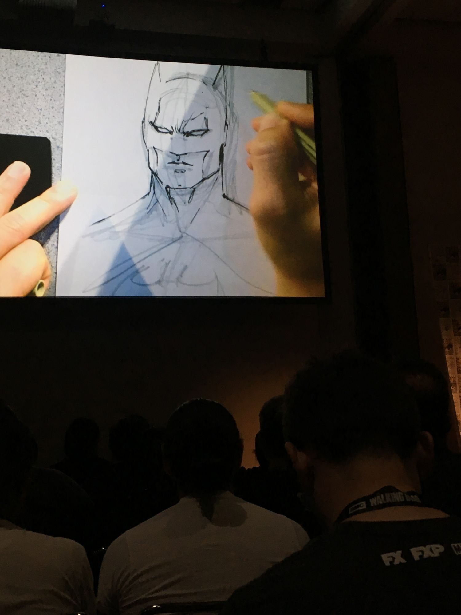 He invited Tanya Lehoux and two fans up to assist, and each were given a different task. Lehoux was to draw Batman in any style she desired (she chose Sailor Moon), and the young man, Justin, was instructed to draw the caped crusader in Lee's style (he was able to do this to a high level of success).