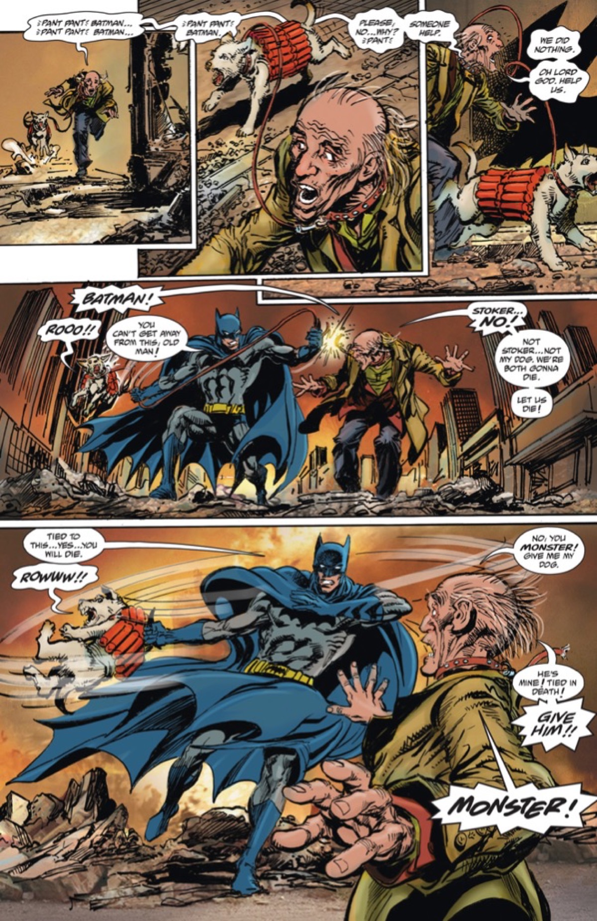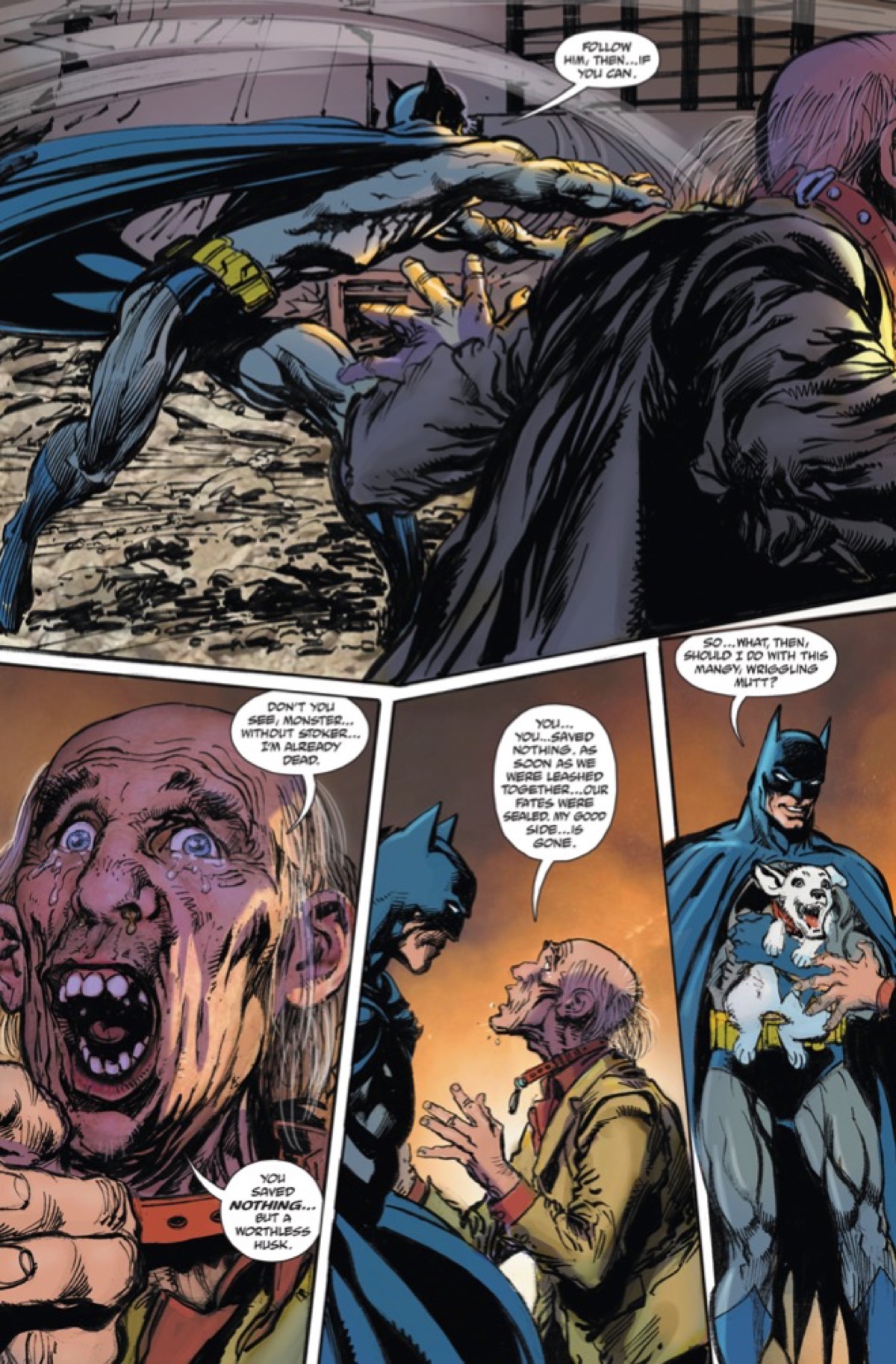 Here's two pages from next Wednesday's Batman vs. Ra's Al Ghul #1, as Batman scares the crap out of a loving dog owner by pretending to toss his pooch away to be blown up by dynamite. But just kidding, Batman saved the pup after all. Now to figure out who's behind this… which, judging by the title of the series, is presumably Ra's al Ghul. Check out the preview below.
