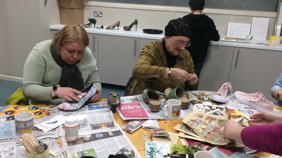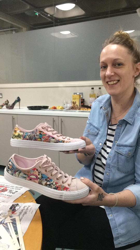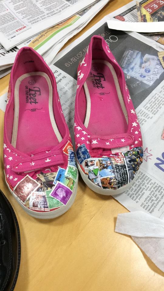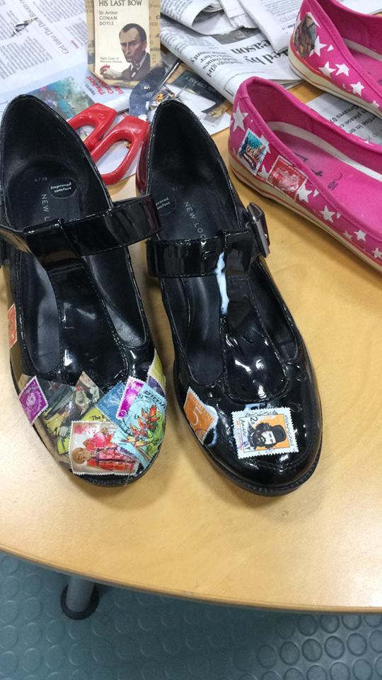 Sheryl Hall of Thrifty Couture has been running workshops in Hampstead, England, this week, encouraging people to turn comic books into footwear. Taking old unused shoes, boots, sneakers and slippers, and using comic books to re-create them as comic book styled fashion.