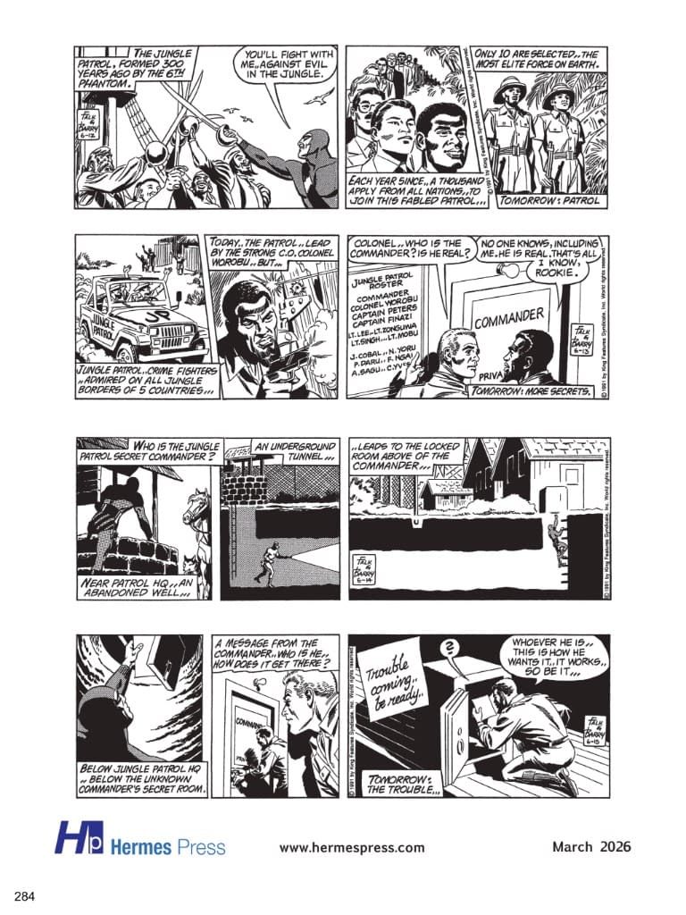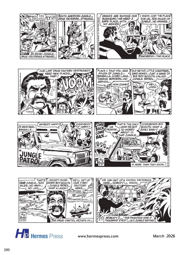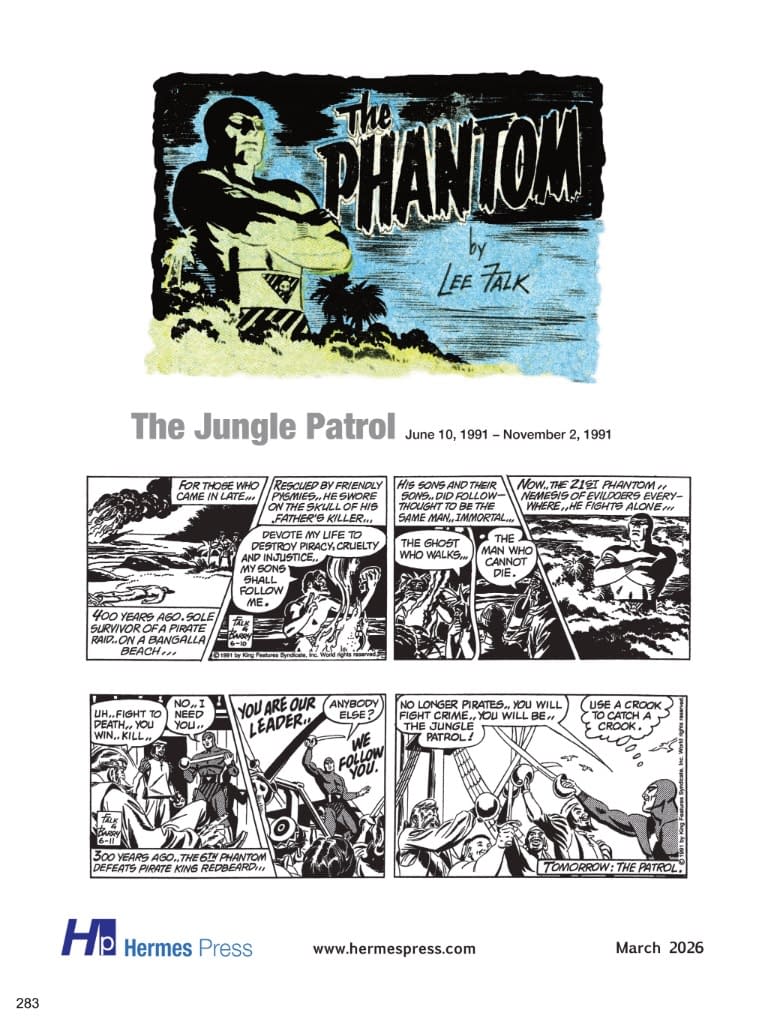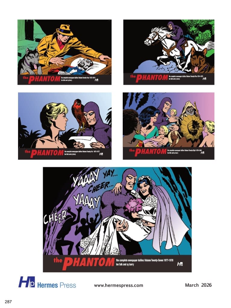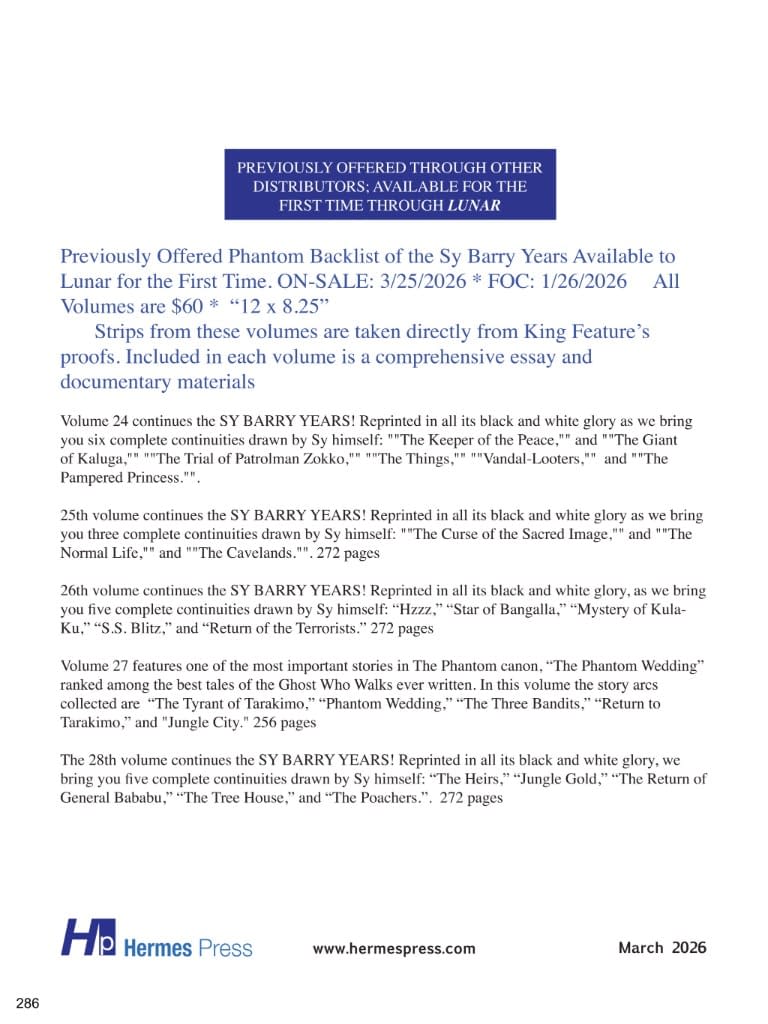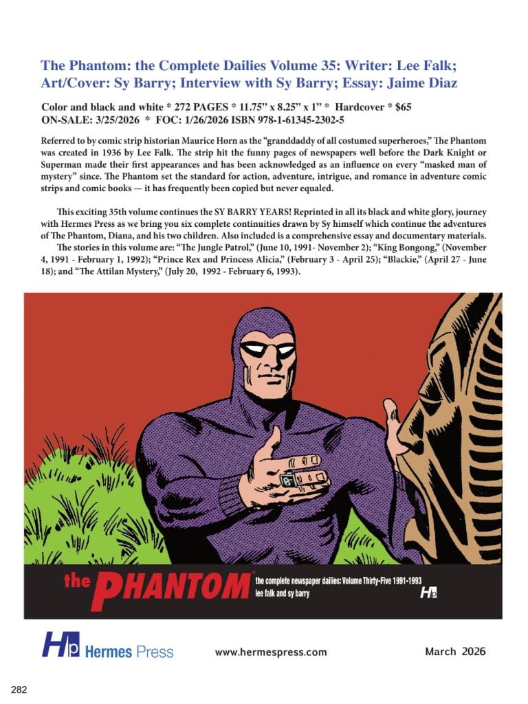 Referred to by comic strip historian Maurice Horn as the "granddaddy of all costumed superheroes," The Phantom was created in 1936 by Lee Falk. The strip hit the funny pages of newspapers well before the Dark Knight or Superman made their first appearances and has been acknowledged as an influence on every "masked man of mystery" since. The Phantom set the standard for action, adventure, intrigue, and romance in adventure comic strips and comic books — it has frequently been copied but never equaled. This exciting 35th volume continues the SY BARRY YEARS! Reprinted in all its black and white glory, journey with Hermes Press as we bring you five complete continuities drawn by Sy himself which continue the adventures of The Phantom, Diana, and his two children: " Also included is a comprehensive essay and documentary materials. $65 3/25/2026