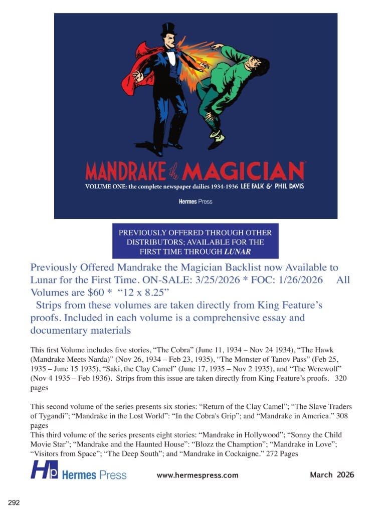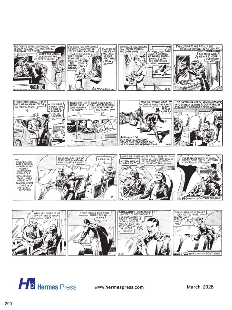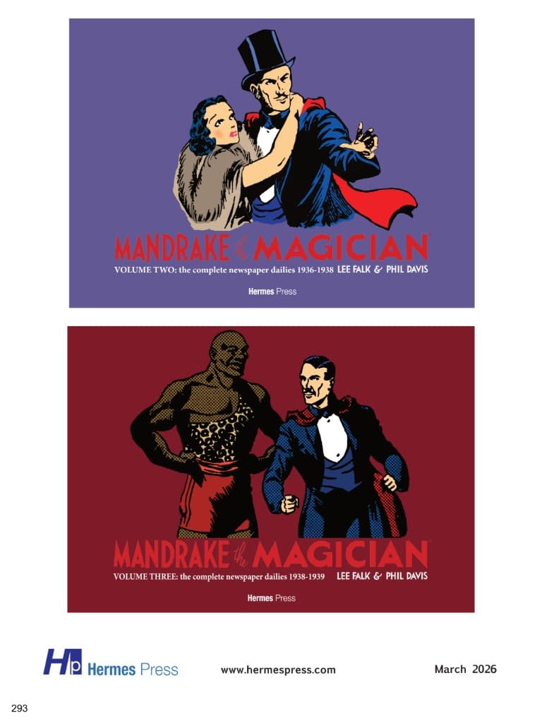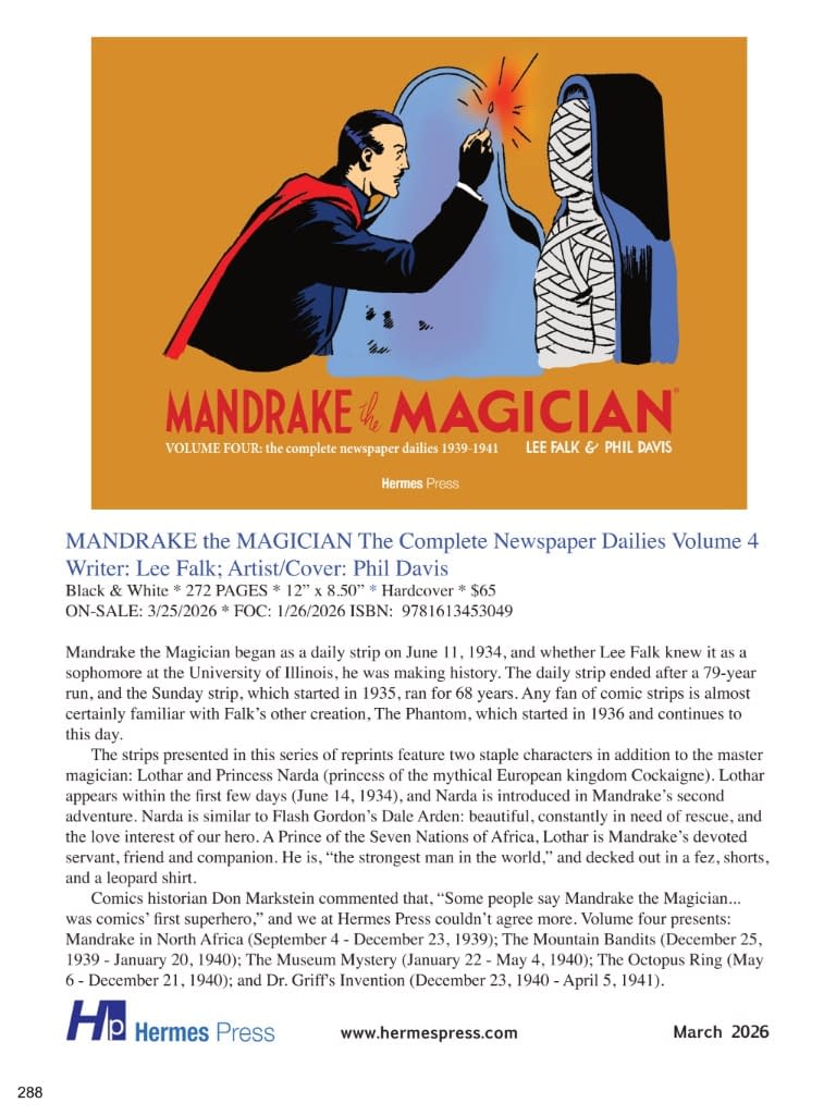Mandrake the Magician began as a daily strip on June 11, 1934, and whether Lee Falk knew it as a sophomore at the University of Illinois, he was making history. The daily strip ended after a 79-year run, and the Sunday strip, which started in 1935, ran for 68 years. Any fan of comic strips is almost certainly familiar with Falk's other creation, The Phantom, which started in 1936 and continues to this day. Mandrake the Magician whisked readers to exotic locales (often fictional amalgams of the Orient, the Middle East, India or Eastern Europe) and immersed them in extended narratives with memorable villains and a colorful support cast. The strips presented in this series of reprints feature two staple characters in addition to the master magician: Lothar and Princess Narda (princess of the mythical European kingdom Cockaigne). Lothar appears within the first few days (June 14, 1934), and Narda is introduced in Mandrake's second adventure. Narda is similar to Flash Gordon's Dale Arden: beautiful, constantly in need of rescue, and the love interest of our hero. A Prince of the Seven Nations of Africa, Lothar is Mandrake's devoted servant, friend and companion. He is, "the strongest man in the world," and decked out in a fez, shorts, and a leopard shirt. Comics historian Don Markstein commented that, "Some people say Mandrake the Magician… was comics' first superhero," and we at Hermes Press couldn't agree more. Volume four presents: Mandrake in North Africa (September 4 – December 23, 1939); The Mountain Bandits (December 25, 1939 – January 20, 1940); The Museum Mystery (January 22 – May 4, 1940); The Octopus Ring (May 6 – December 21, 1940); and Dr. Griff's Invention (December 23, 1940 – April 5, 1941). $65 3/25/2026