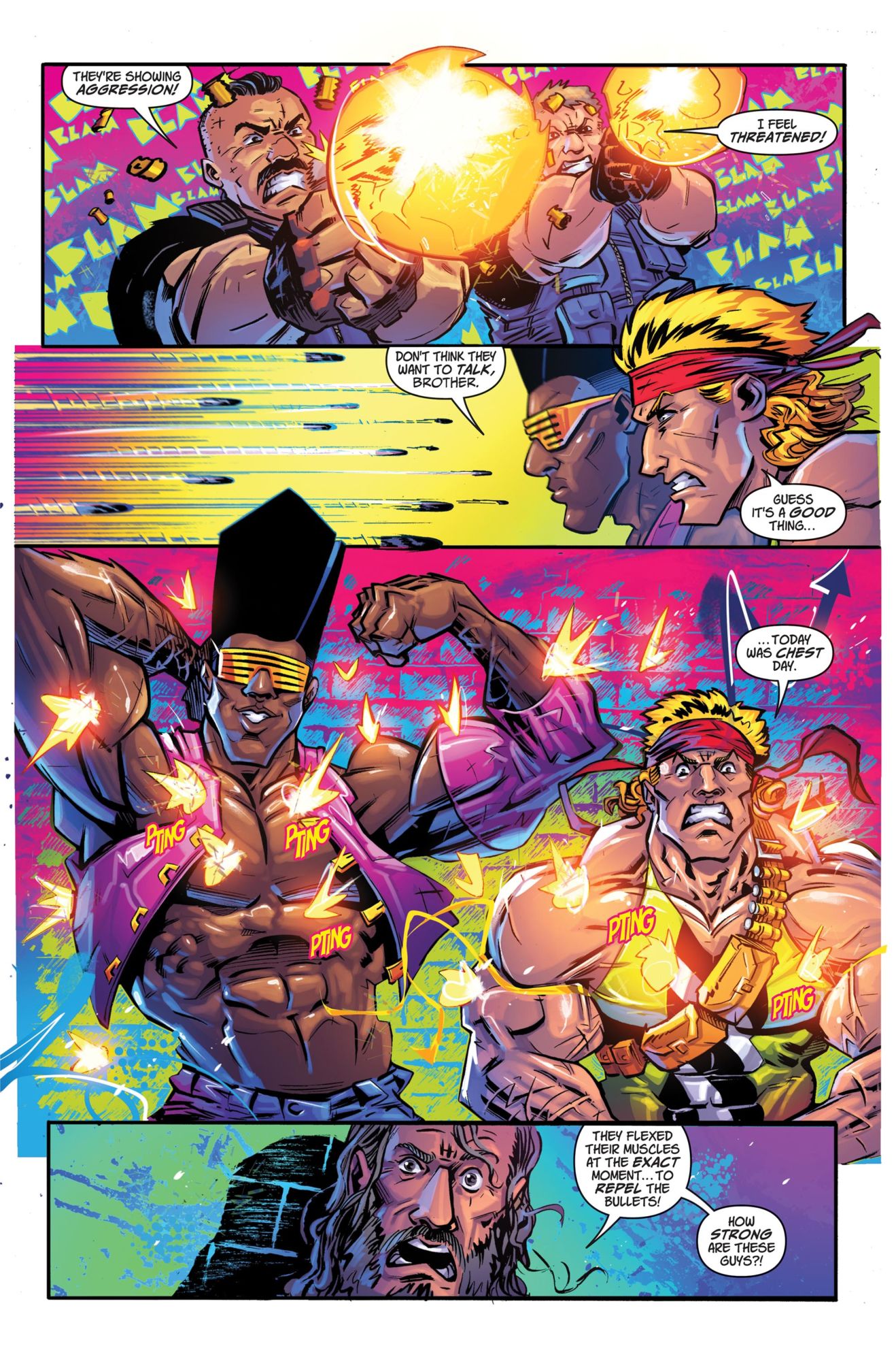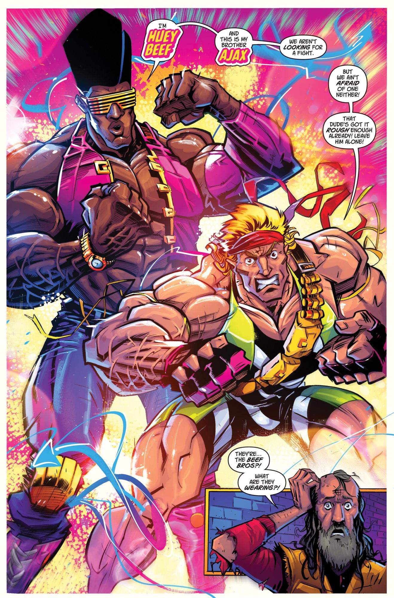 The solution? BEEF BROS, an eye-searing, gonzo comic about Huey and Ajax Beef, a pair of neighborhood heroes willing to brawl with sadistic police, cruel landlords, and predatory corporations not because of any complicated college-boy theorizing, but because helping people out is simply the right thing to do.