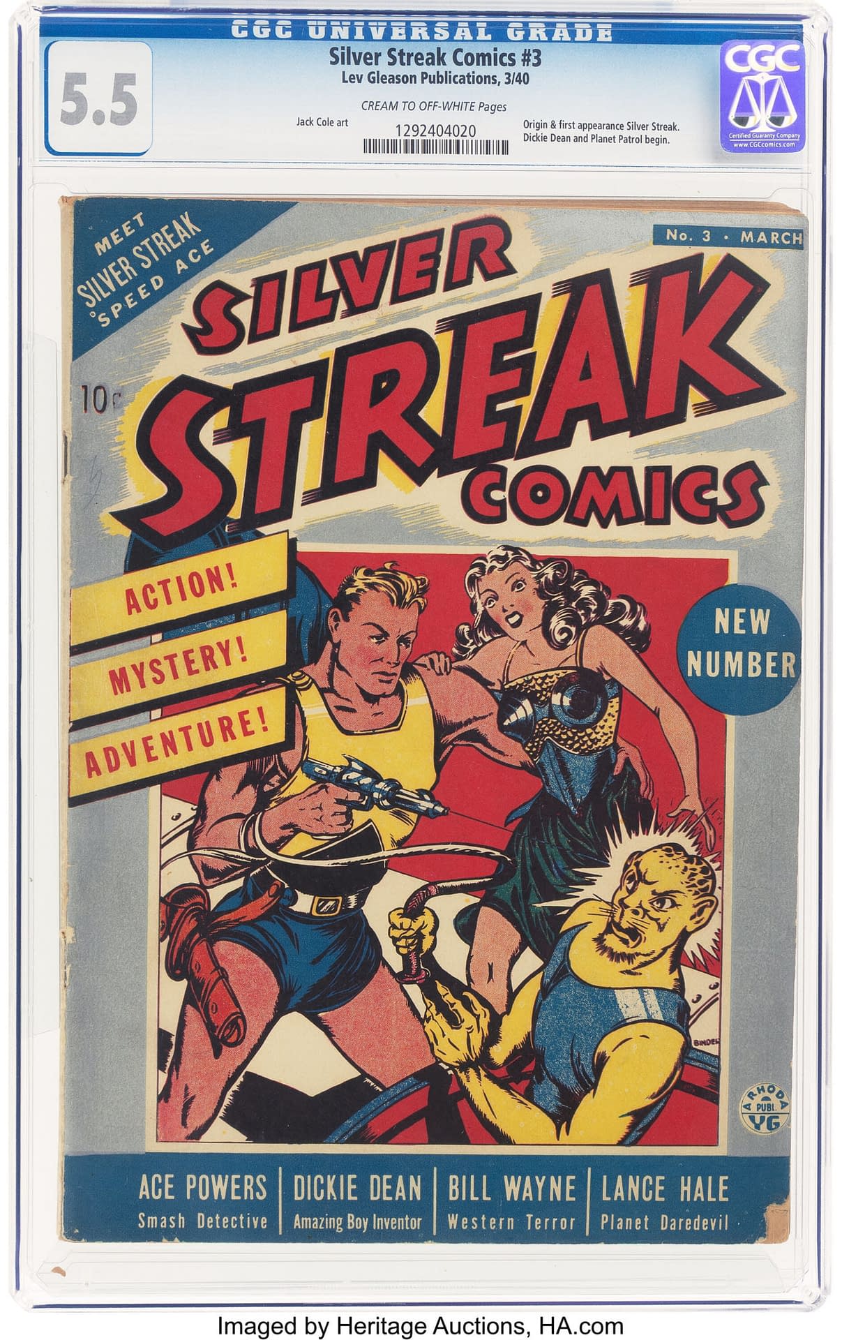 Only 14 total copies of Silver Streak #3 have been graded by CGC in any condition, with only 11 unrestored copies, and just five graded higher than CGC 5.5. It's been at least eight years since a nicer copy has been available than this CGC FN- 5.5 Cream to off-white pages copy of Silver Streak Comics #3 (Lev Gleason, 1940) up for auction in the 2025 October 16 Golden Age Comics Century Showcase Auction III at Heritage Auctions.