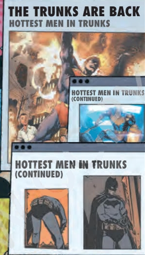 Which includes some gossip playing on the word that Superman and Batman now have their trunks back.