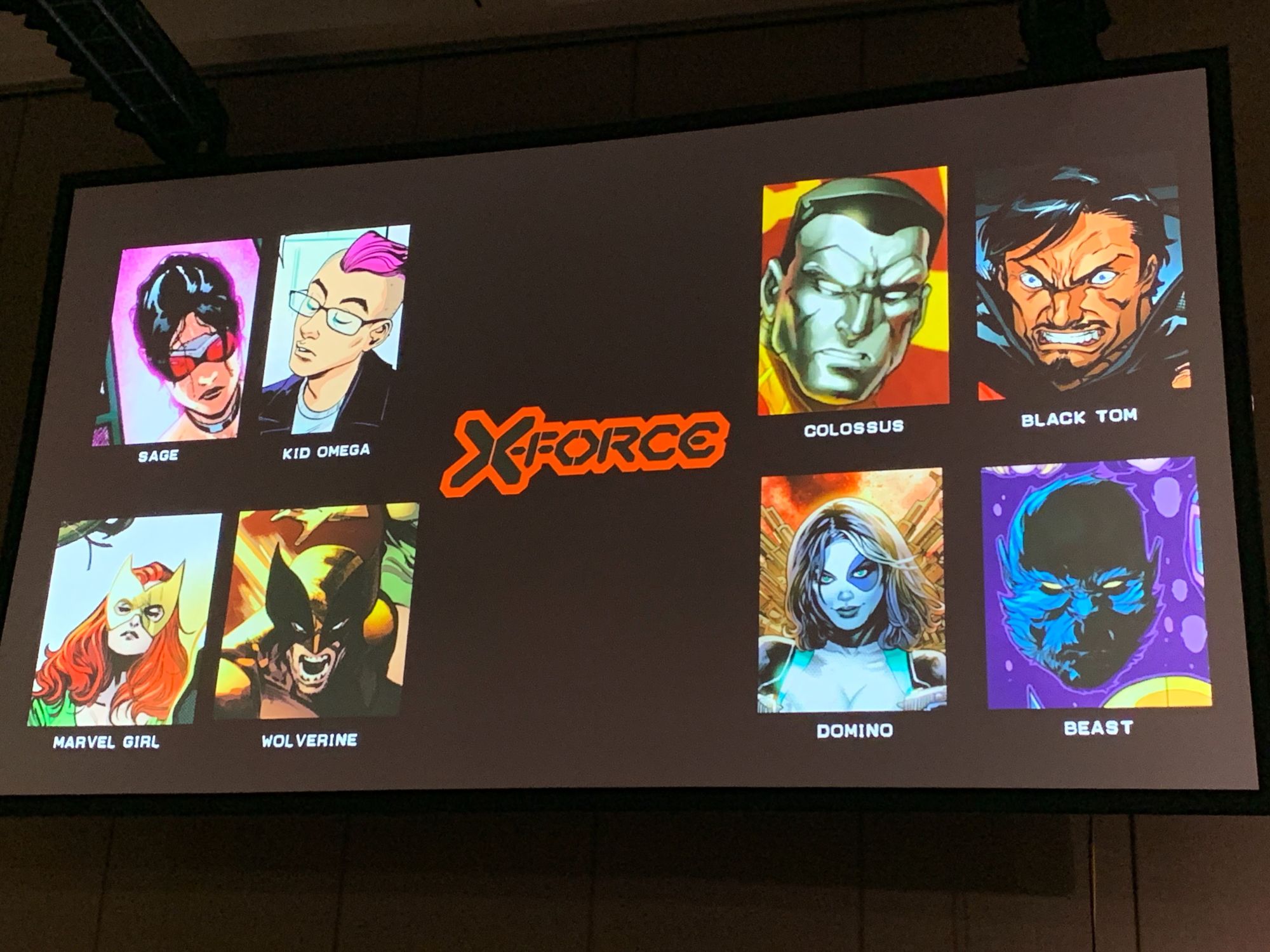 We're off and running with X-Men announcements from the Marvel Next Big Thing panel at San Diego Comic-Con. C.B. Cebulski, Jordan White, Nick Lowe, and Jonathan Hickman are onstage revealing the new books, creative teams, and rosters for six new X-Men series to launch after House of X and Powers of X wrap up. Hickman hand-selected the teams and plans to work closely with them on the titles. So far, we've seen Marauders by Gerry Duggan and Matteo Lolli, featuring Bishop, Kitty Pryde, Iceman, Emma Frost, Pyro, and Storm, and launching in October, as well as Excalibur, by Tini Howard and Marcus To, starring Rogue, Apocalypse, Jubilee, Captain Britain (Betsy Braddock), Rictor, and Gambit, and also launching in October.