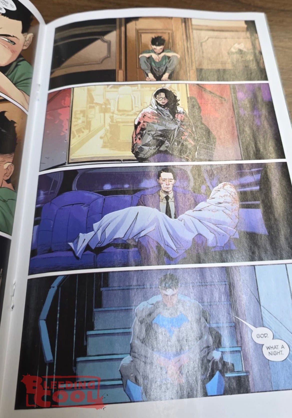…. Bruce lands a few fatherly blows, to the admonishment of the memory of Alfred Pennyworth for whom this abode was named. And because this is Bleeding Cool, we get to go a few pages further in… as everyone has a bit of a sit down.