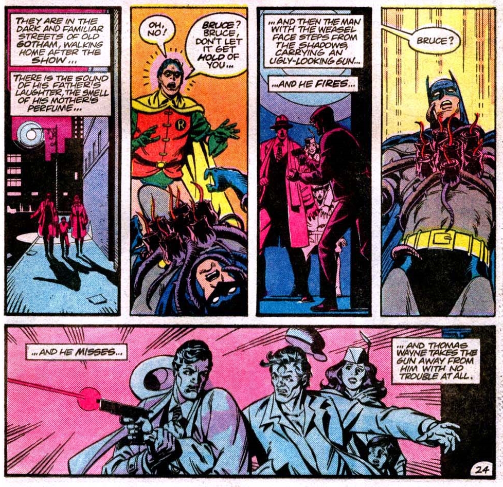 So Booster gives Bruce Wayne that — a world in which his parents never died and Batman never was, to show Bruce the need for Batman. Which… hang on, wasn't that also in The Man Who Has Everything for a little bit?