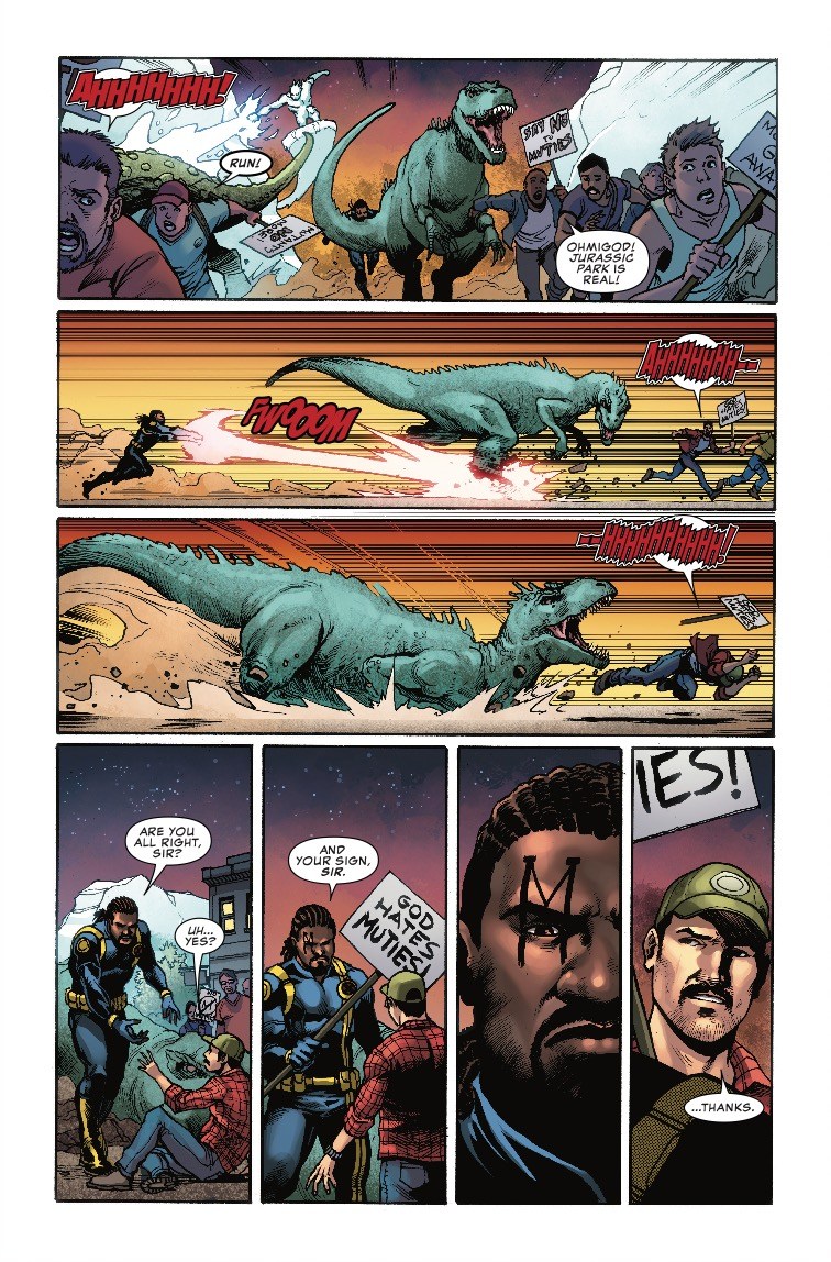 The X-Men protect a world that fears and hates them, and yes, apparently, that even means saving anti-mutant protestors. So when dinosaurs run rampant amongst an anti-mutant hate rally, the X-Men intervene, saving the protestors. But saving their lives isn't enough, at least for Bishop, who takes things a step further, really killing one protestor with kindness by returning his "God Hates Mutants" sign.