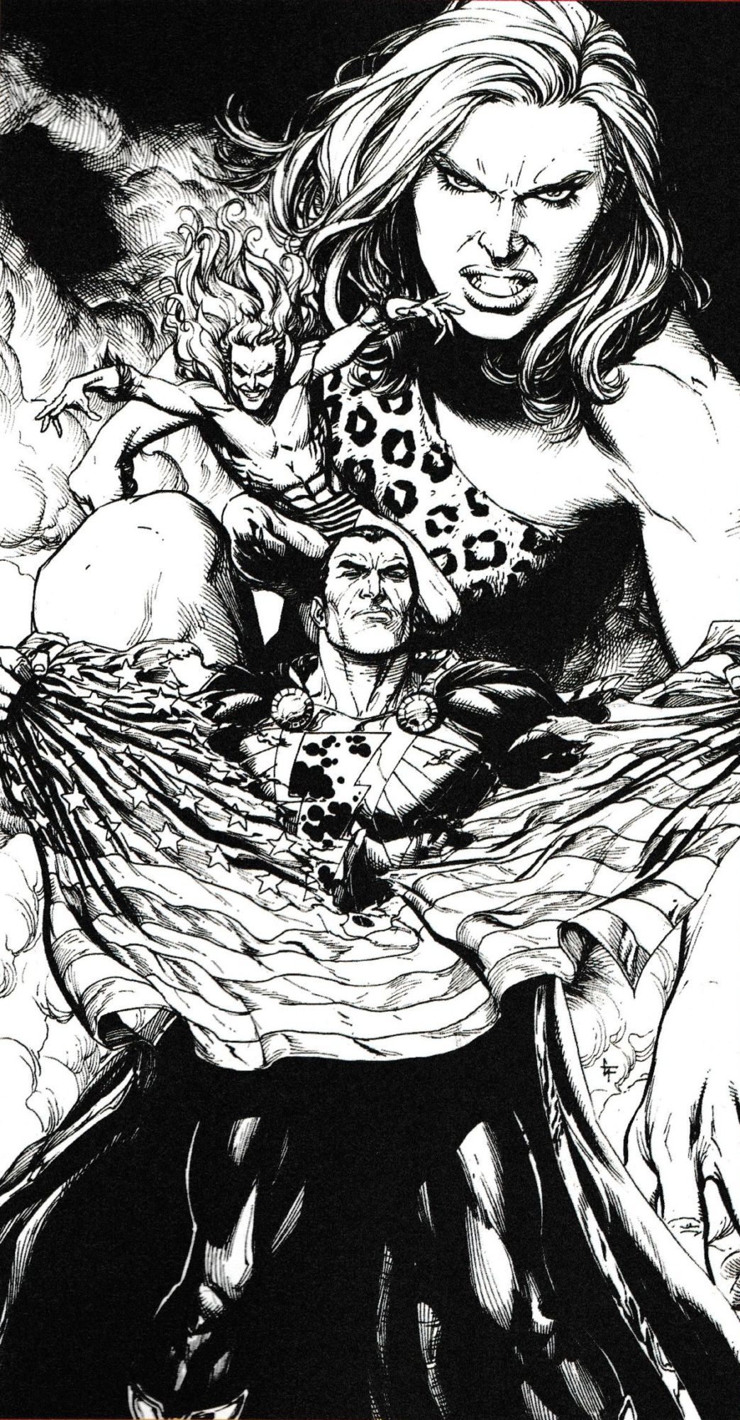 A new image for an upcoming cover of Doomsday Clock, Geoff Johns and Gary Frank's unauthorised sequel to Watchmen, appears in DC Comics titles today, featuring Black Adam tearing apart the Stars And Stripes flag of the USA while Creeper dances behind him and Giganta towers over him…