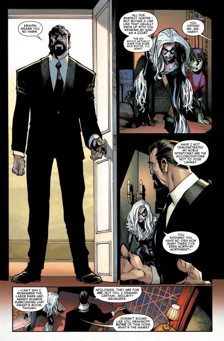 Kraven the Hunter has reinvented his image for the Hunted storyline happening in Amazing Spider-Man. Gone is the animal fur vest with no shirt look as Kraven dons a business suit to sell the opportunity to hunt animal-themed supervillains to bored billionaires. But some things, it seems, never change, as Black Cat learns when Kraven reveals she's being used as a prop in a storyline about a male hero in this preview of next week's Amazing Spider-Man #17