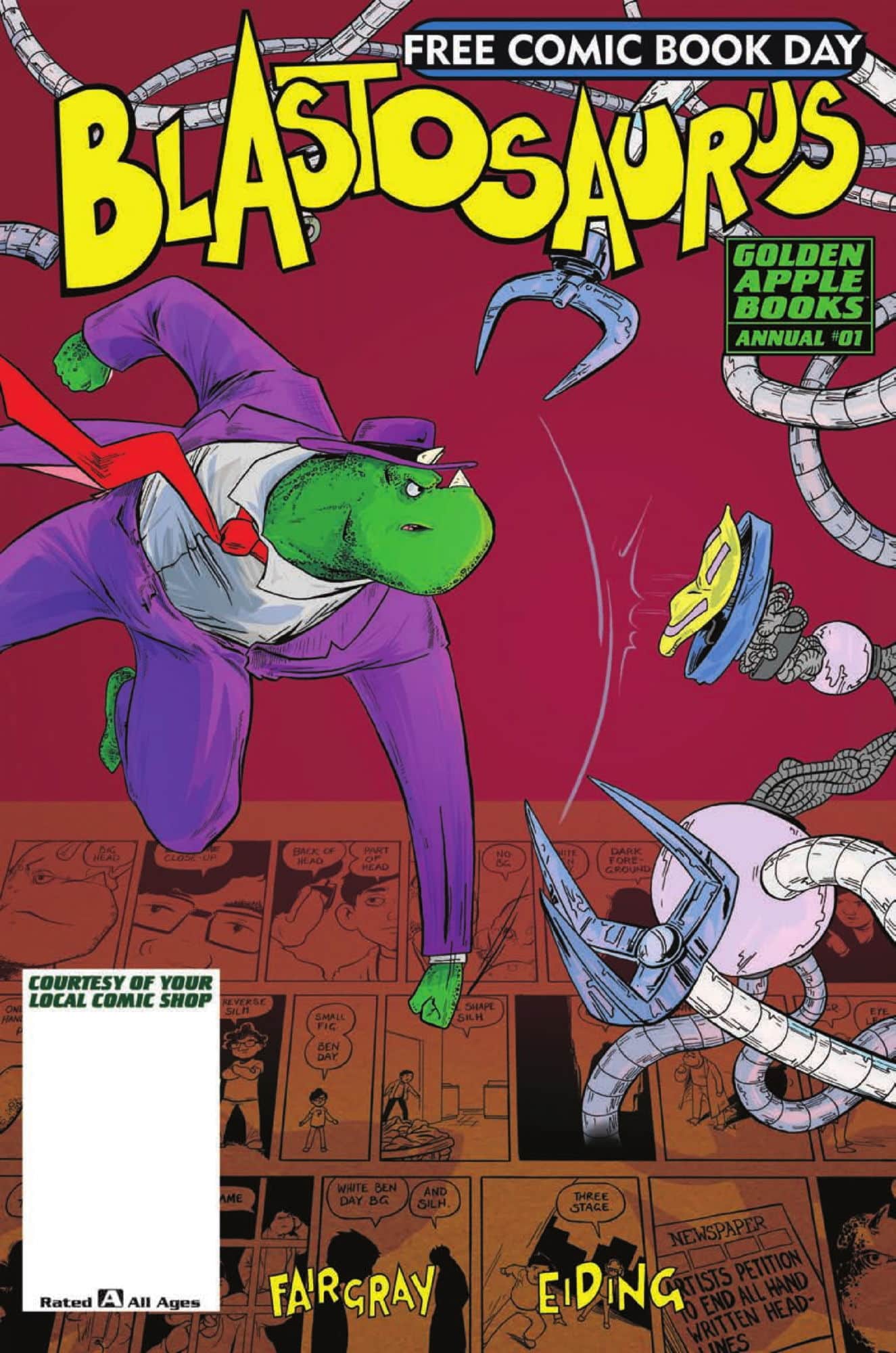 And one retailer is publishing their own comics – Golden Apple Comics of Los Angeles became a publisher this year, Golden Apple Books, with Blastosaurus. And as a retailer who knows that fellow retailers have to pay for the Free Comic Book Day comics they give away, they're giving away free fully priced comics to retailers who order 15 copies of this freebie, previewed below.