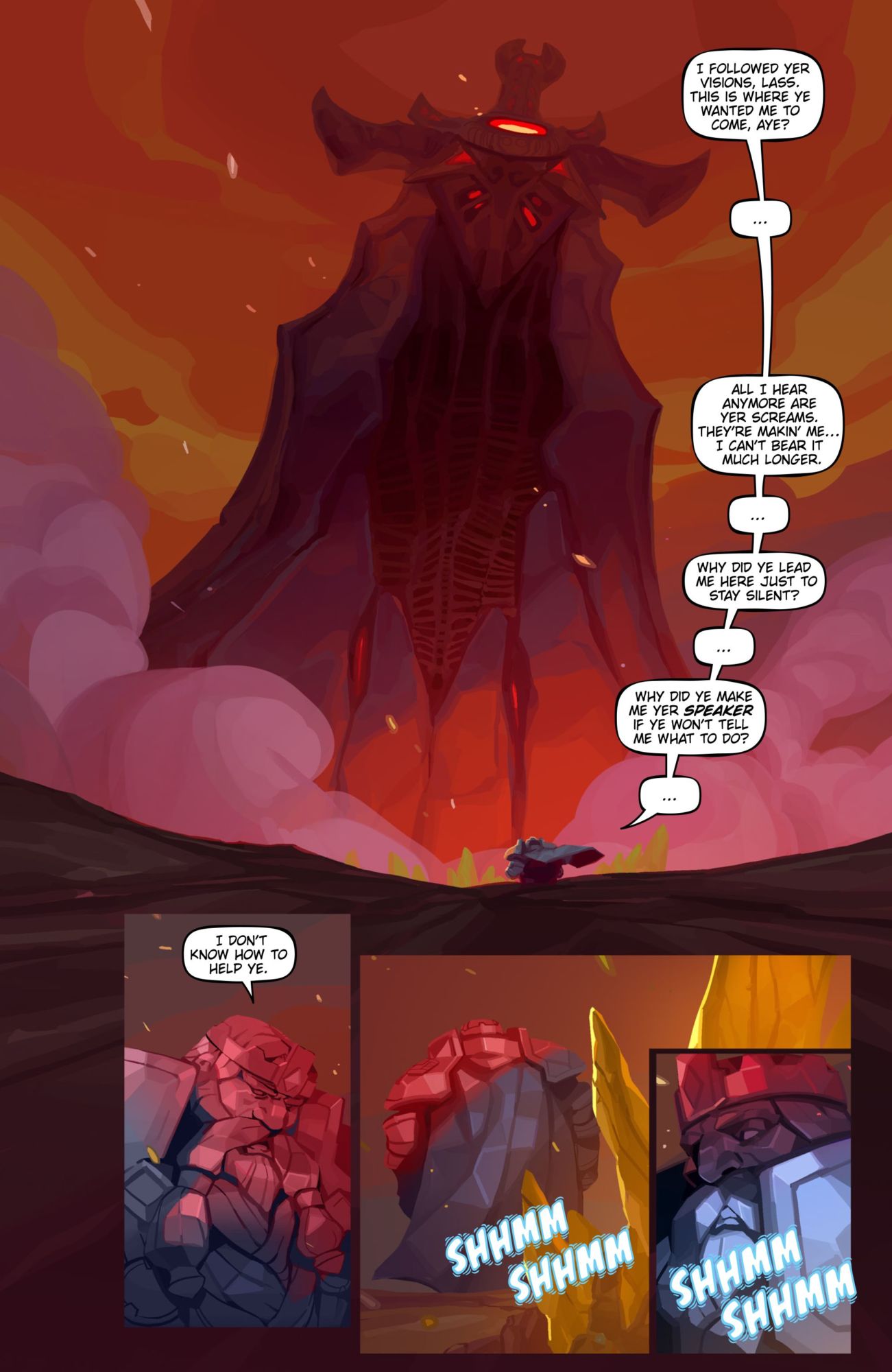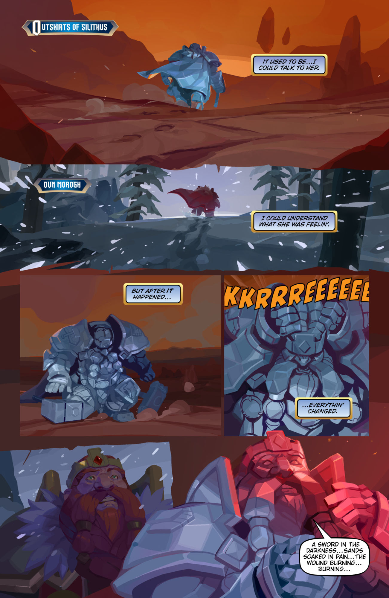 Part of the setup for this comic involves the consequences of Azeroth being wounded by the sword of Sargeras in Legion. Magni's connection with Azeroth's spirit is weakened, and he can't feel her as he once did. He can't get a clear message from her, so he's gone to Silithus, the site where Sargeras plunged his sword. He's been drawn there because he thinks he might be able to find out why, and whether he can find a way to reconnect with Azeroth.