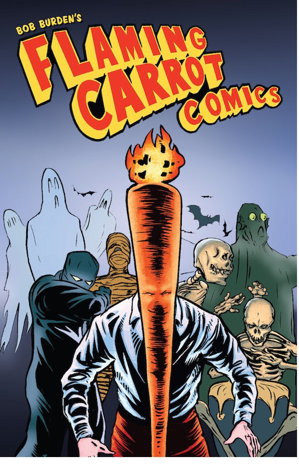 Now, out of print for years, Dark Horse Comics brings you Bob Burden's 400-page Flaming Carrot Comics Omnibus, written and illustrated by Bob Burden, taking us right down the rabbit hole of creativity-gone-off-the-tracks and over the rainbow.