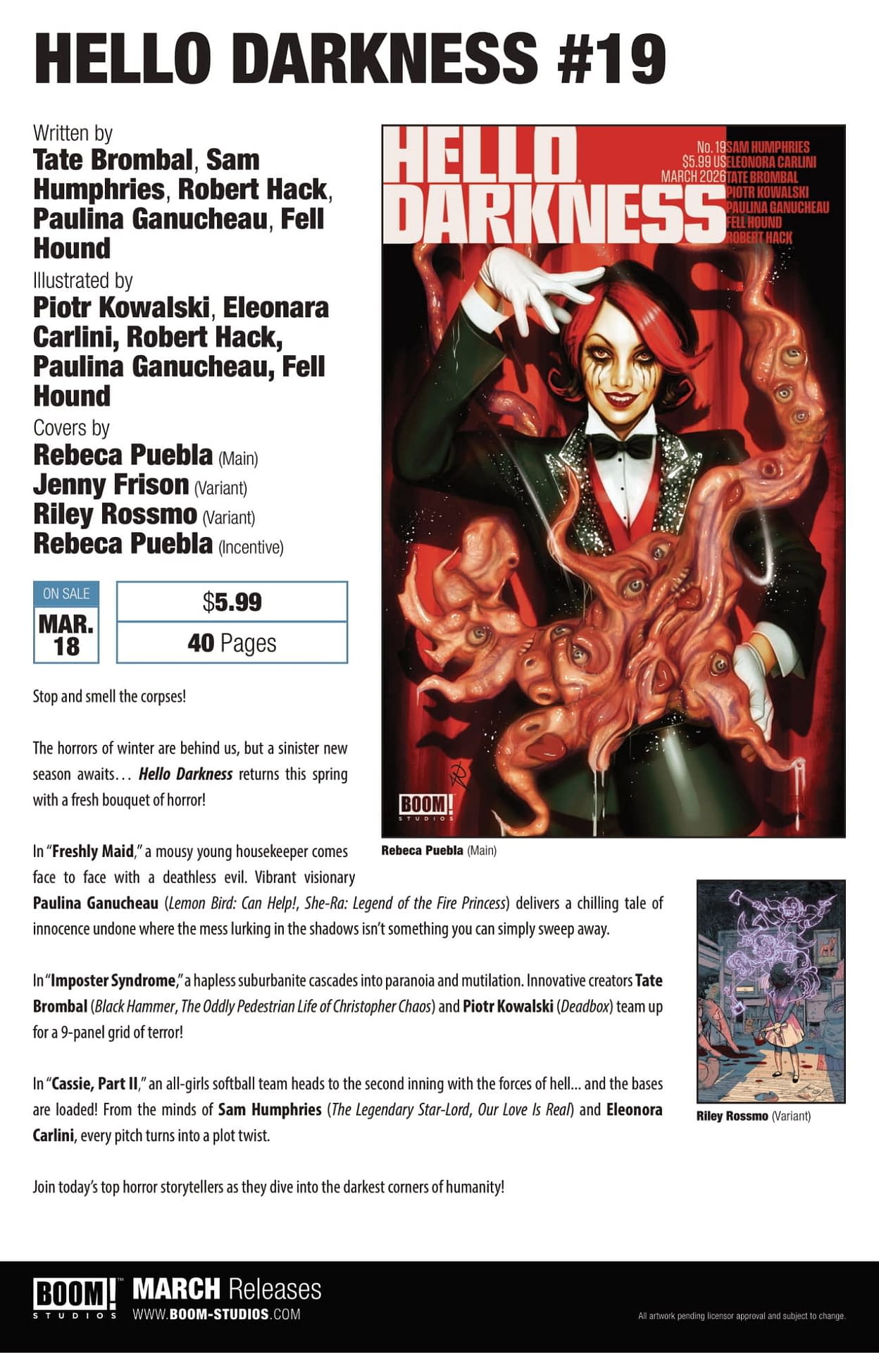 In "Cassie, Part II," an all-girls softball team heads to the second inning with the forces of hell… and the bases are loaded! From the minds of Sam Humphries (The Legendary Star-Lord, Our Love Is Real) and Eleonora Carlini, every pitch turns into a plot twist.