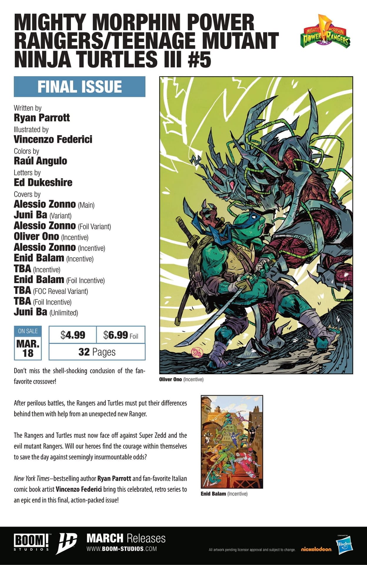 With the relentless attacks on innocent civilians and a shocking new breed of Evil joining the fray, even the combined strength of the Mighty Morphin Power Rangers and the Teenage Mutant Ninja Turtles might not be enough to stop the chaos.