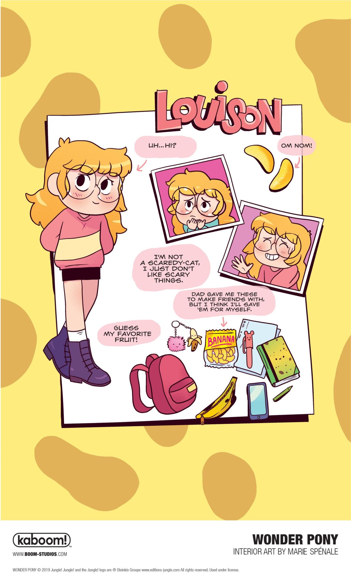 Louison is a heroine I would have liked to be in sixth grade: a girl who's a little bit shy, but courageous, and who learns to overcome the monsters that haunt her school thanks to Jean-Pierre, a tiny magic pony! Thanks to him, she becomes super strong and very popular. The dream, right? I hope you have as much fun reading as I did when I wrote and drew it!