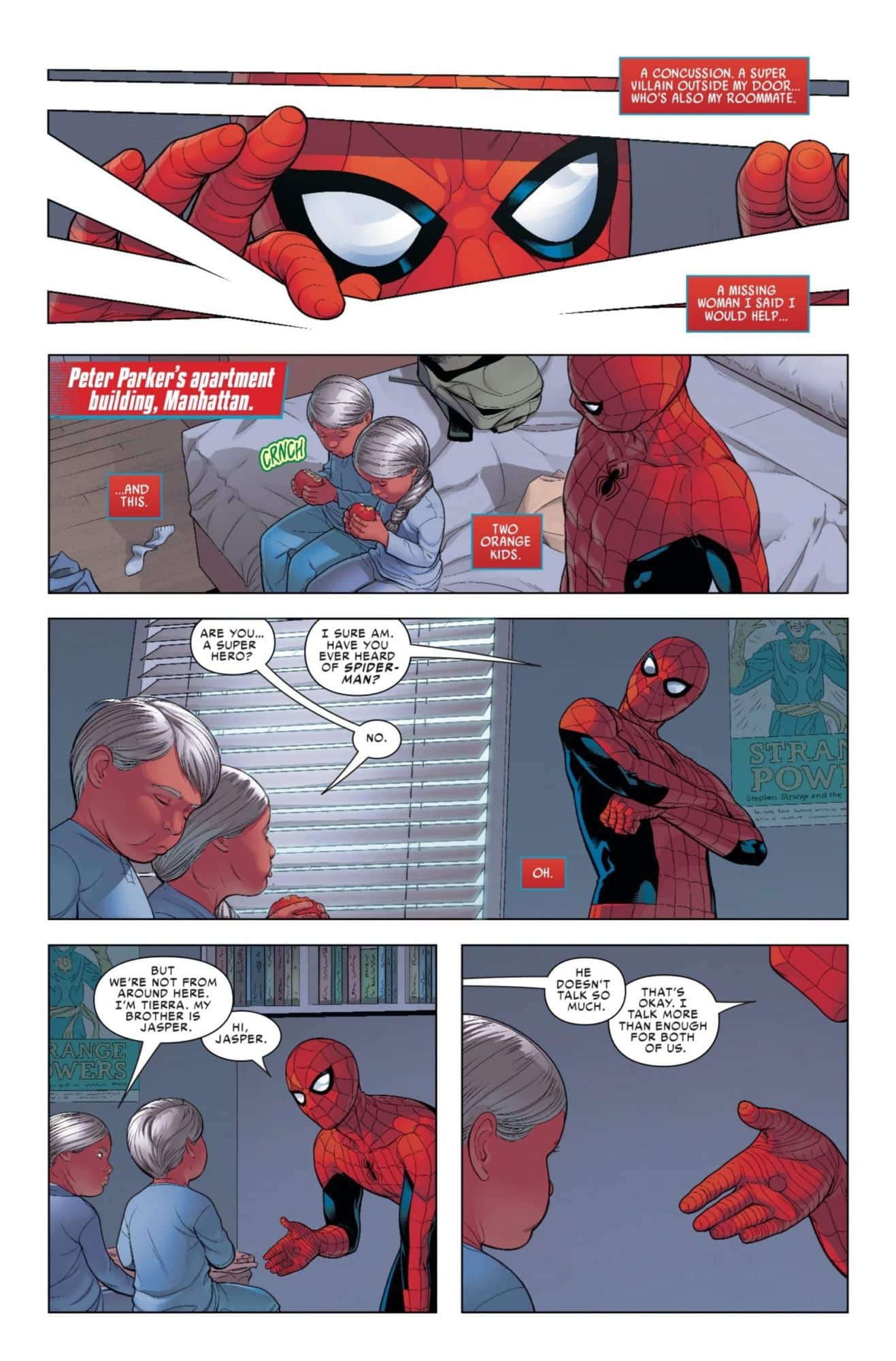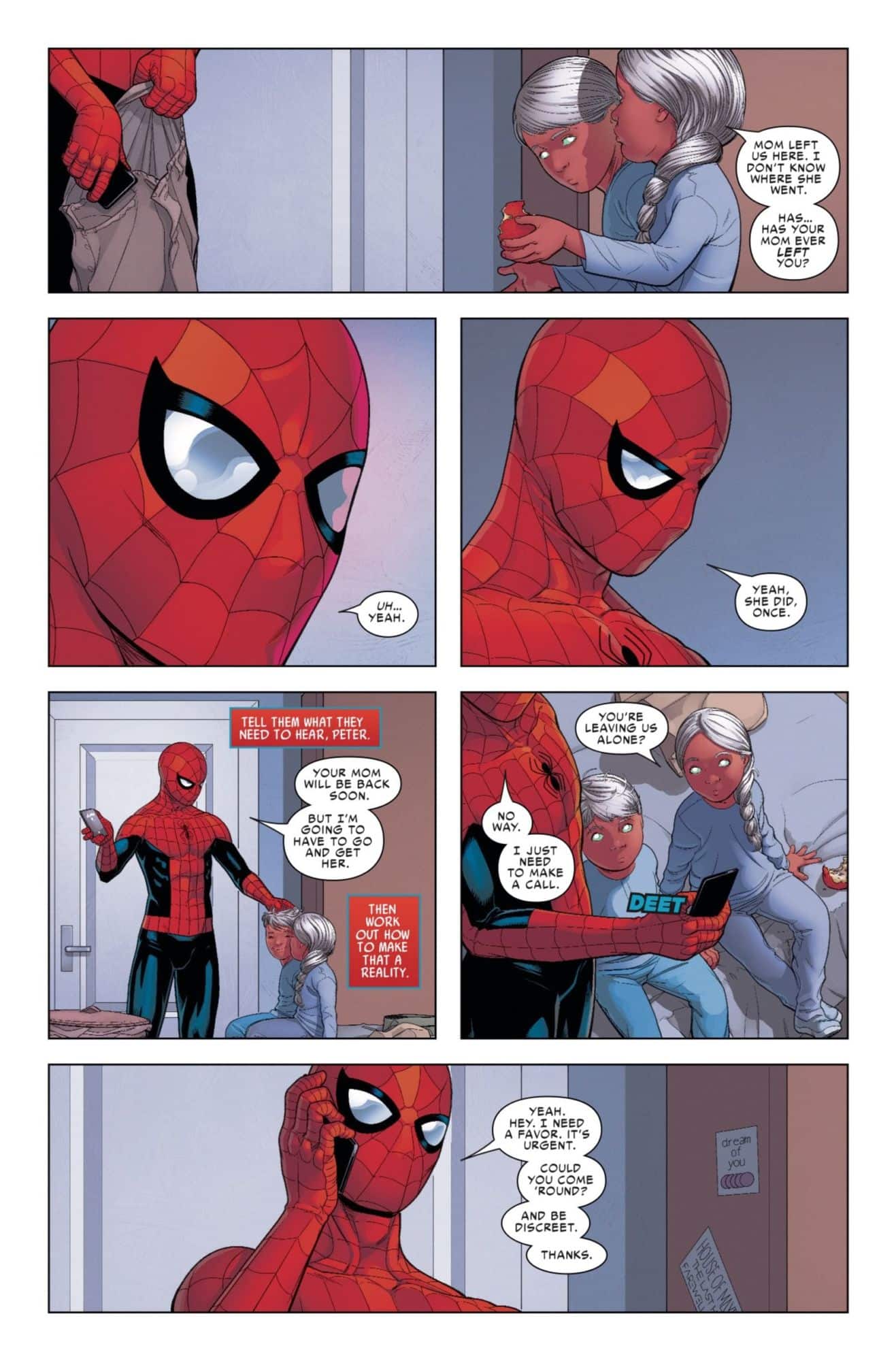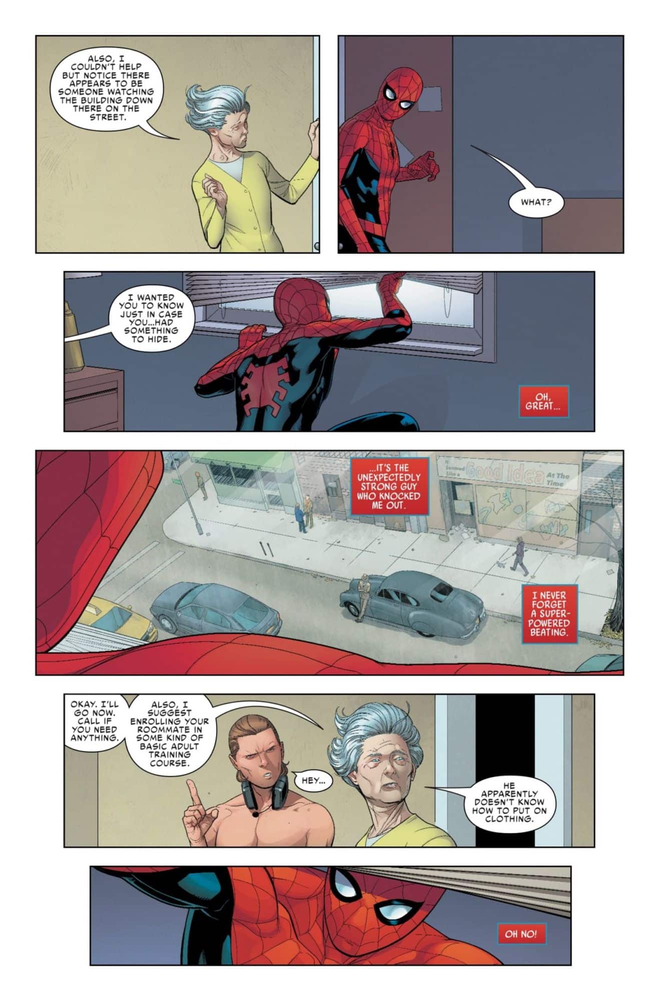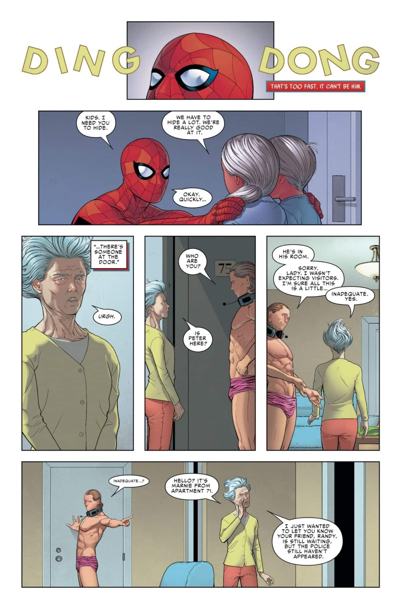 Next week sees the release of the second issue of Friendly Neighborhood Spider-Man, the latest Spider-person book to fill Marvel readers' seemingly unlimited demand for such things. In the previous issue, Peter Parker found himself the unwitting caretaker of two strange children after their mother was kidnapped by super-strong suit-wearing villains. He's got to go get their mom back, but first, he needs a babysitter, so he reaches out to… well, we don't get to find out in this preview, because before Spider-Man's first choice of babysitter arrives, his cranky neighbor Marnie arrives to find Spider-Man's roommate, the D-list villain Boomerang, hanging out in his… or maybe Spider-Man's, if you read last issue… underwear. Yeah, there's a lot you're missing out on if you don't read all the Spider-people books.