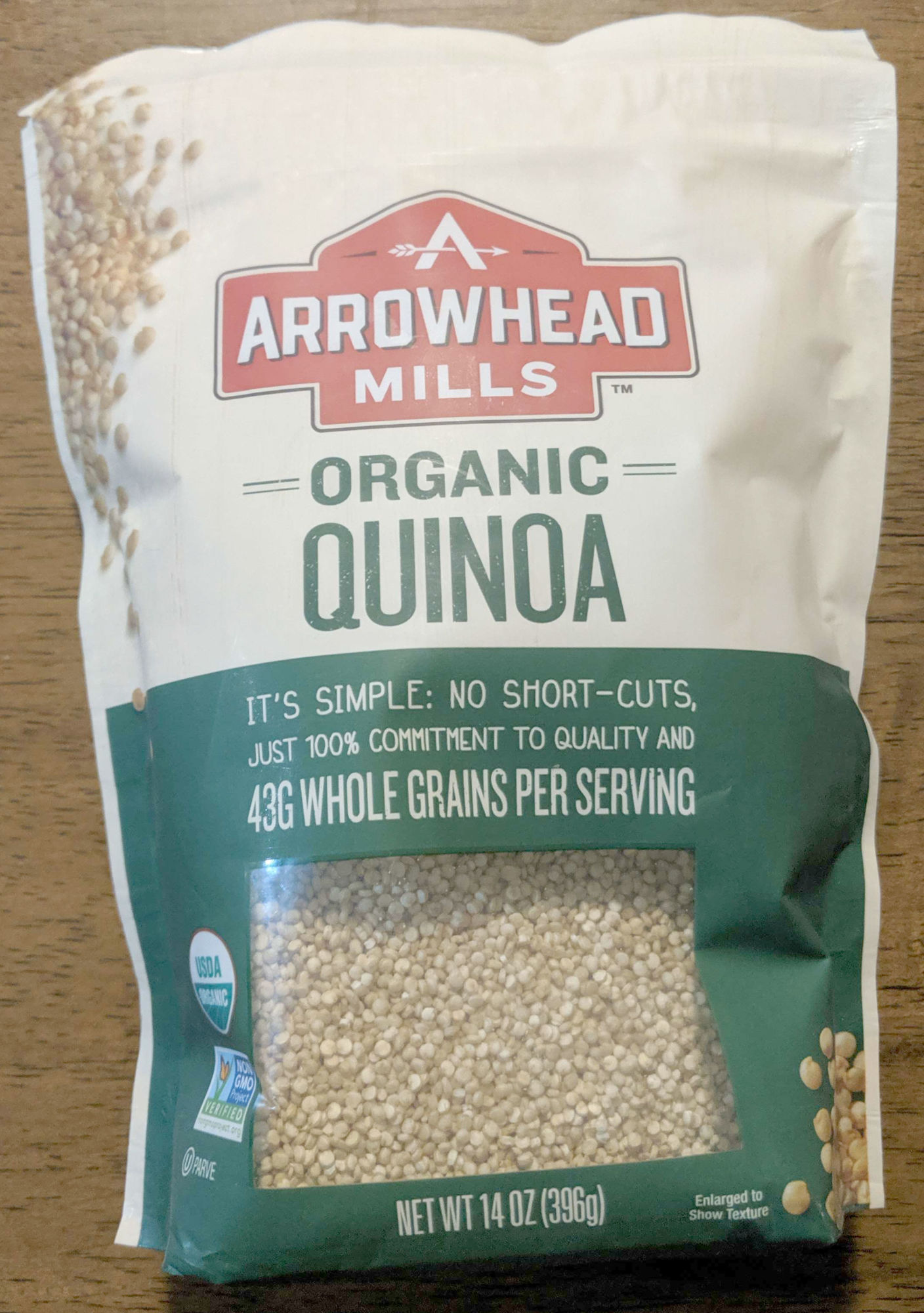 We're not entirely sure how this unopened bag of organic quinoa ended up in the pantry. Maybe we bought it under the delusion we would get serious about health and stop eating junk food. Maybe it's just there to scare the children. Whatever its origin, one thing for certain is that the 43 grams of whole grains this bag purports to contain is exactly 43 more whole grains than we are likely to eat on any given day.