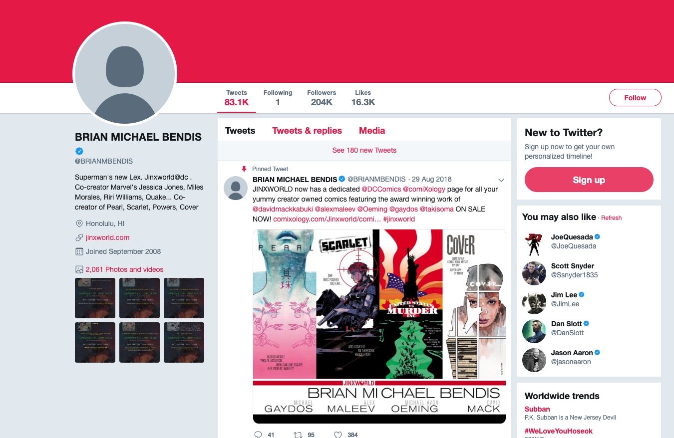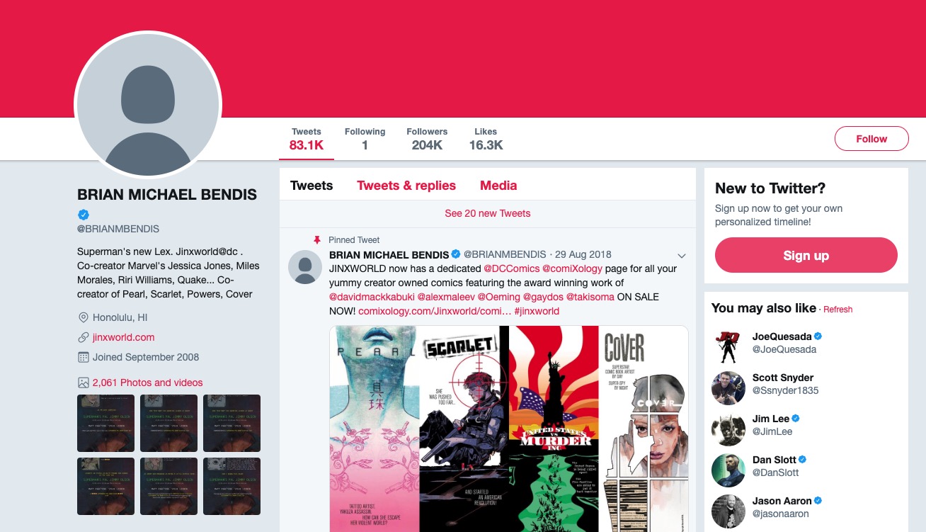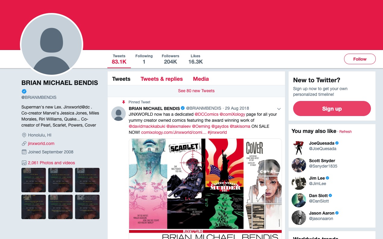Thankfully, by 10AM Pacific time, the terror seemed to be over, as Bendis had seemingly regained control of his account, changing his name back to Brian M. Bendis and removing the false profile photos, header images, and tweets from the account. However, not all evidence of the hack is gone, as the location of Bendis's profile is still listed as Honolulu instead of Portland, where Bendis resides. Additionally, Bendis appears to be engaged in an ongoing struggle with the hackers, as the "New Tweets" alert at the top his page has been dramatically increasing for the past 45 minutes, with hundreds of new tweets noted in the alerts but none actually making it to the profile. Presumably, "The Great One" is using all of the might in his thumbs to delete the tweets as soon as they appear, sweat pouring down his brow as he fights the battle of a lifetime, every bit as heroic as the fictional characters he writes in his comics.